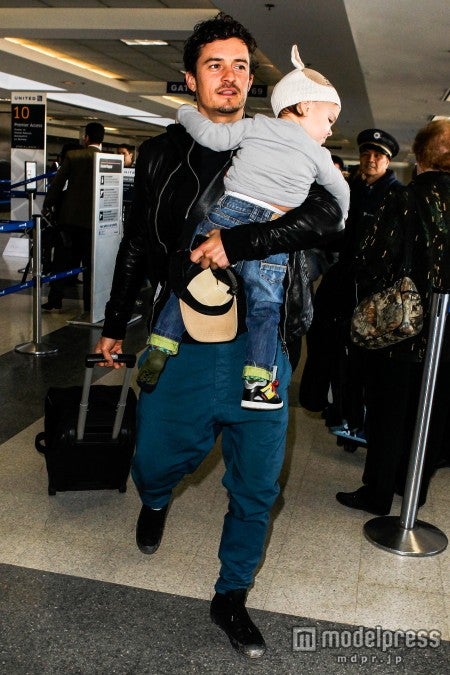 夫のオーランド・ブルーム(36)、息子のフリン君(2)とLAX空港にやってきたミランダ。ボトムスはスキニーデニム、トップスはアニマル柄から黒ブラがまる見えのスケスケシャツという装いです。