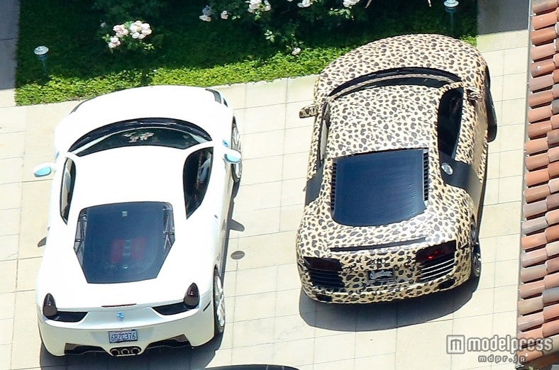 その豪邸をパパラッチが上空から撮影した写真を見ると、玄関前に高級車が2台並んでとめてあり、1台は白いフェラーリ。そしてもう1台が125ポンド(約1900万円)はするというアウディR8という高級車なのですが、高級感ゼロのヒョウ柄プリント状態に!!