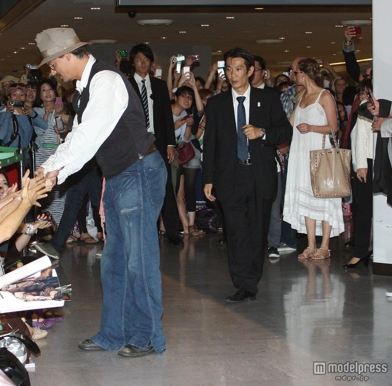 空港にはいつもながら大勢のファンがお出迎え。そんななか登場したジョニーは、数人のファンと握手、ちびっ子ファンとはしゃがんでお話ししたりしていました。