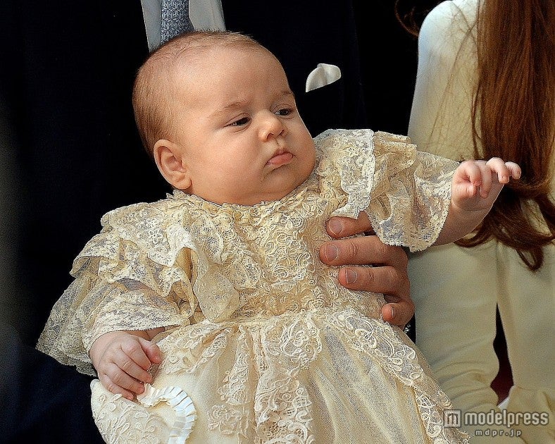 ジョージ王子はエリザベス女王のドレスを製作しているアンジェラ・ケリーにより仕立てられたサテンとレースのガウンで登場。その表情は王室メンバー、そしてマスコミが注目するなかでも落ち着き払った様子です。