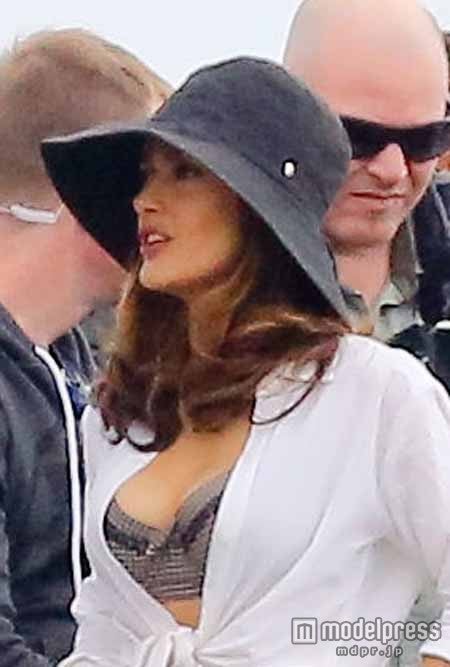 ダイナマイトなボディの持ち主サルマ・ハエックが、新作映画の撮影中にセクシーな胸元をパパラッチされました。
