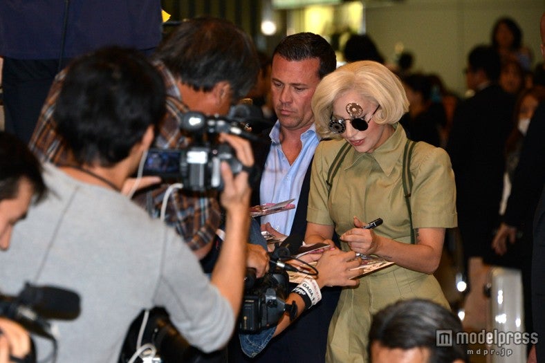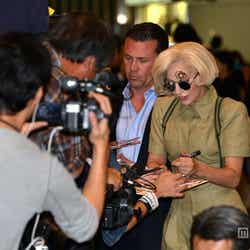 到着ロビーには、お出迎えするため約500人もの日本のファンが集結。大歓声が響き渡る中、ガガは、ファンのサインや写真に笑顔で応じた。
