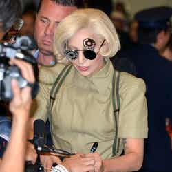 カーキのシャツとパンツのセットアップに15センチ以上あるブラックのヒールを合わせたミリタリーコーディネートで登場したガガ。さらに、ダイヤル風サングラスを身に付けるなど、今回も奇抜なファッションを披露した。