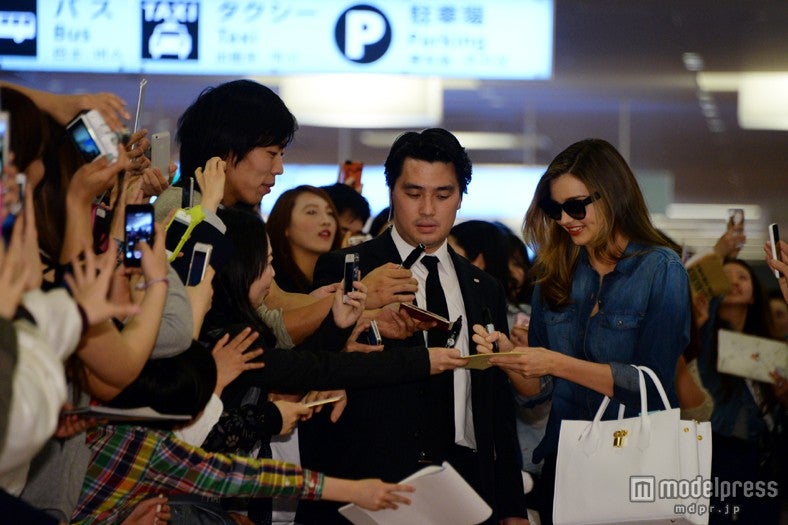 デニムシャツ×黒のレザーパンツに、アクセントとして鮮やかなピンクのスニーカーを合わせたコーディネートで登場したミランダ。出迎えに集まった多くの日本のファンが大歓声を送る中、ミランダはファンのサインに笑顔で応じた。