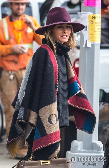 オリヴィアがお散歩していたのはNYのブルックリン。オリヴィアは今、セレブに大人気の「バーバリー」のカラーブロックブランケットケープを羽織っていてとってもステキ。ケープは別料金で入れられる「O.P」のイニシャル入りです。