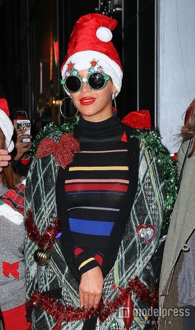 ニットのボーダードレスの上にツリーをイメージしたグリーンのニットコートを着たビヨンセはその上にキラキラモールをまき付け、クリスマスオーナメントを配置。さらにサンタの帽子にクリスマスツリーのサングラスをかけた気合い入りまくりなコーディネイト。