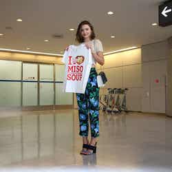 約150名のファンが待ちわびる中、おへそがちらりと見える長さのベージュのトップスに白のジャケットを羽織り、夏らしいあさがおの色鮮やかなパンツ姿で成田空港に到着したミランダ。