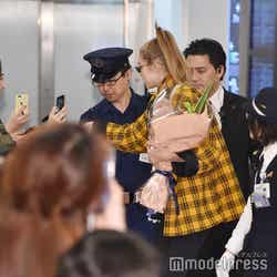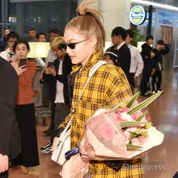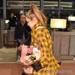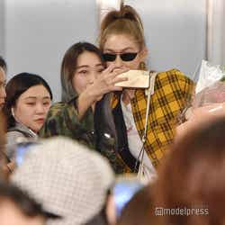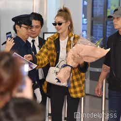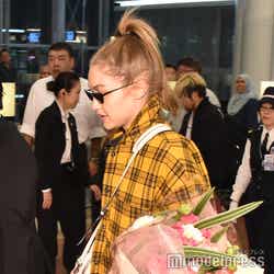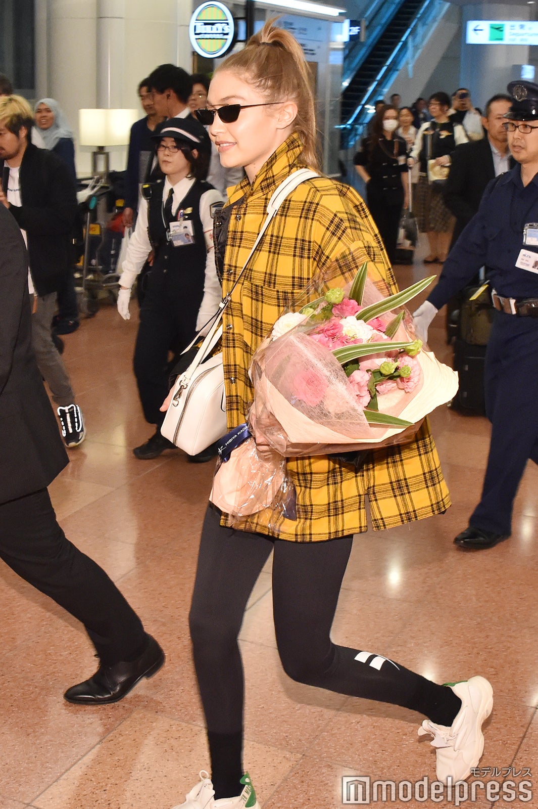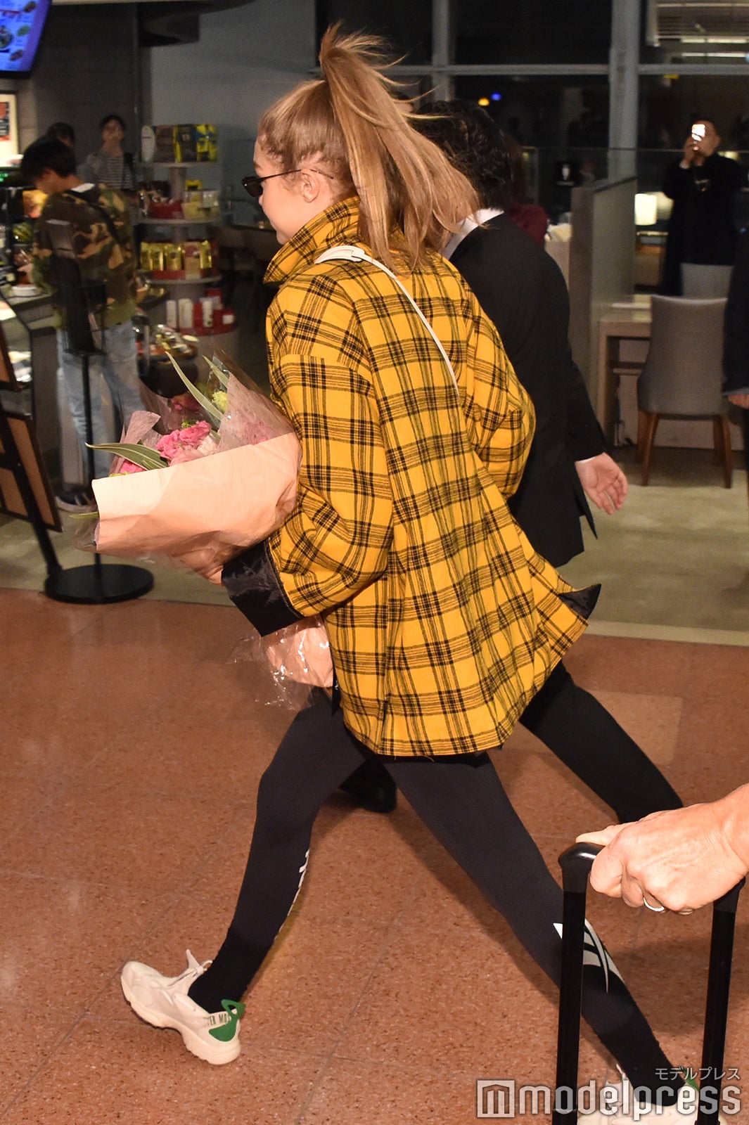 19時55分着の便で羽田空港に到着し、同国際線旅客ターミナルに姿を見せたジジは、イエローのチェックジャケット×黒のスキニーパンツというコーディネートにサングラスというラフなスタイル。