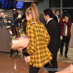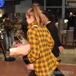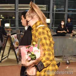 プレゼントされた花束を手に報道陣が待ち構えるスペースへ近づき、報道陣からの「ジジ!」の問いかけに「ハーイ!」とだけ応じて、立ち止まることなく颯爽と関係者口へ歩いて行った。(modelpress編集部)