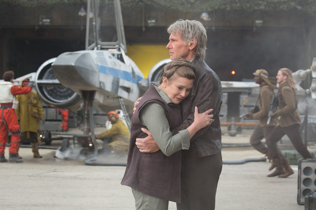 L to R: General Leia Organa (Carrie Fisher) and Han Solo (Harrison Ford)