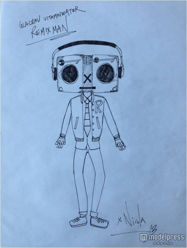 ニコラ氏は、ニューヨーク生まれのスタイリッシュな飲料ブランド「glacéau vitaminwater(R)(グラソー ビタミンウォーター)」(以下グラソー)とコラボレーションし、“NY生まれのリミックスカルチャー”をテーマに新キャラクター「グラソー リミックスマン」をデザイン。頭はターンテーブルをモチーフ、ボディはカラフルな色合いのニューヨークらしいファッションを着こなすことで“NY リミックスカルチャー”を表現した。