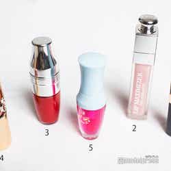 下地:シャネルルージュココボームリップクリーム(1)/ディオールアディクトリップマキシマイザー001(2)口紅:ランコムジューシーシェイカー166ウォークザライム(3)/イブ・サンローランルージュヴォリュプテシャインNo.4(4)