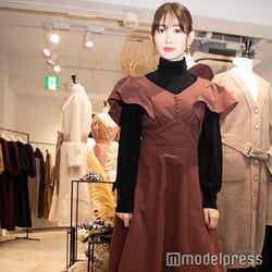 ドレスは9月に発売されたアイテムです。肩の大きなフリルがポイントになっているのですが、生地やシルエットで甘くなりすぎず、大人でも着られるようなディティールにしています。コートを着れないんじゃないかってよく言われるのですが、柔らかい素材なので全然上から着ることができます!