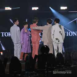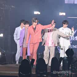 ランウェイでは、やまとはオレンジ、ひゅうがはライトブルー、ゆうたはベージュ、ゆうまは白、あむぎりはラベンダーの淡いカラーで統一した春らしいカラースーツ姿でファンサービスをたっぷりと行いながら仲良くウォーキングを披露。ステージ上で自撮りをする一幕もあり、会場を盛り上げた。