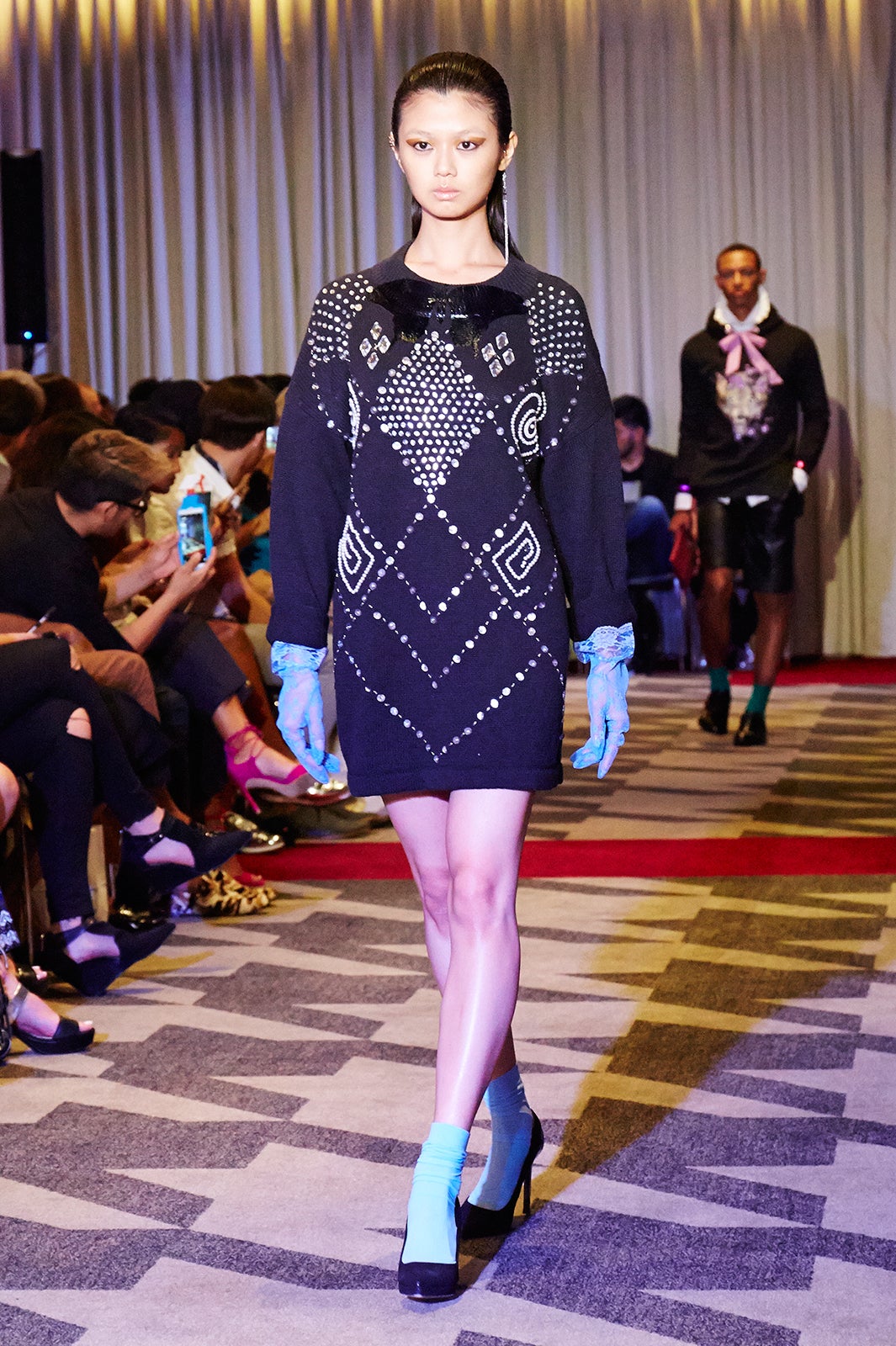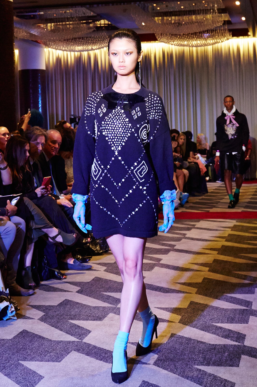 最後にLaQuan Smithのプレゼンテーションに出演しましたが、熱気であふれる会場で約2時間ポージングをとり続けるショーでした。とても過酷でした。他のモデルの中には、倒れてしまう人もいて、会場の外には救急車が待機していました。写真を見てもらうとわかりますが、私も汗だくで立ち続けていました。