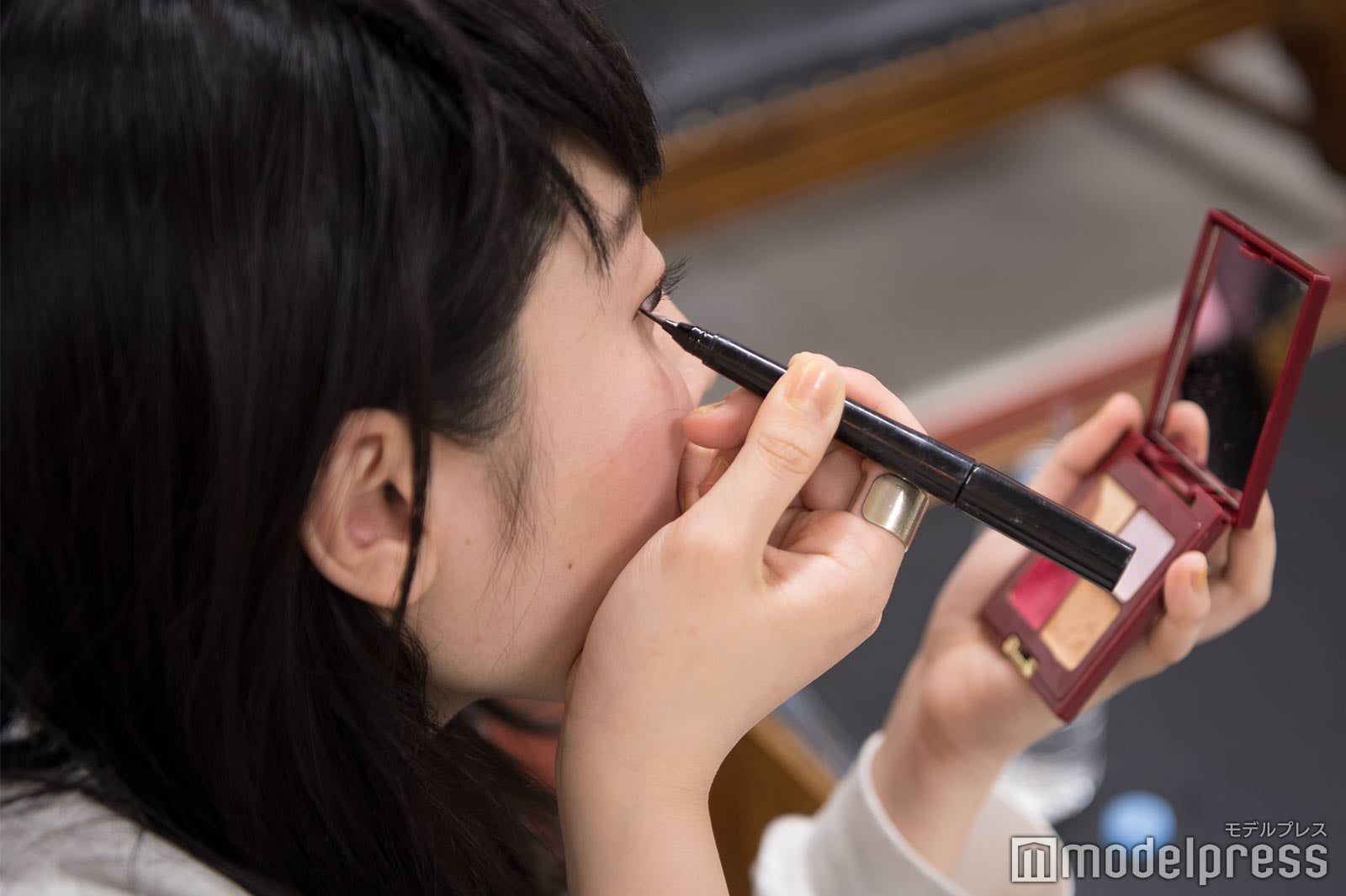 アイメイクの際は、常に“二重の目”をしながら調整していくそう。アイラインはリキッドでかなり太め。目尻はより濃く囲むように。「一重なので、ものまねメイクの時はいつも割とガッツリですね。二重にした時にちょうどいいくらいになるように、二重幅を埋める感じで引きます」