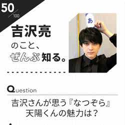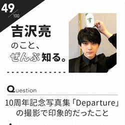事前に読者からの質問募集も行った100問100答は、【1.吉沢亮・解体新書】【2.吉沢亮の日常-Ⅰ】【3.吉沢亮の恋愛観】【4.吉沢亮の日常-Ⅱ】【5.役者・吉沢亮-Ⅰ】【6.役者・吉沢亮-Ⅱ】【7.吉沢亮のルーツ】【8.吉沢亮のマインド】【9.もしも吉沢亮が○○だったら】【10.吉沢亮の未来】の全10ジャンル。1・3・5・7・9はモデルプレス、2・4・6・8・10はアミュモバにて順次公開していく。