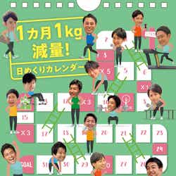 毎日の運動を16名のフジテレビ男性アナウンサーの写真とイラストでわかりやすく紹介。置き換えダイエットも合わせて1か月続けて1㎏の減量(約7000キロカロリーの消費)を目指すことができるカレンダー。