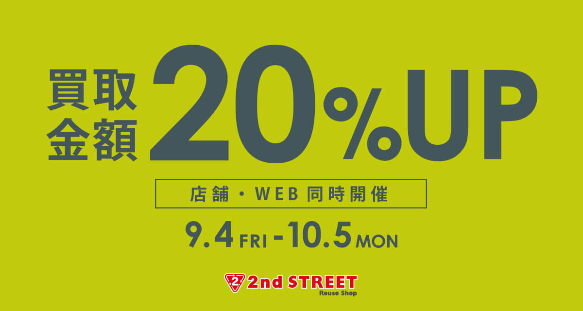 ■開催期間:9月4日(金)~10月5日(月)お持ち込みのお品物の買取金額が通常の20%UPとなるお得なキャンペーン。Web(宅配)買取でも同時開催中。