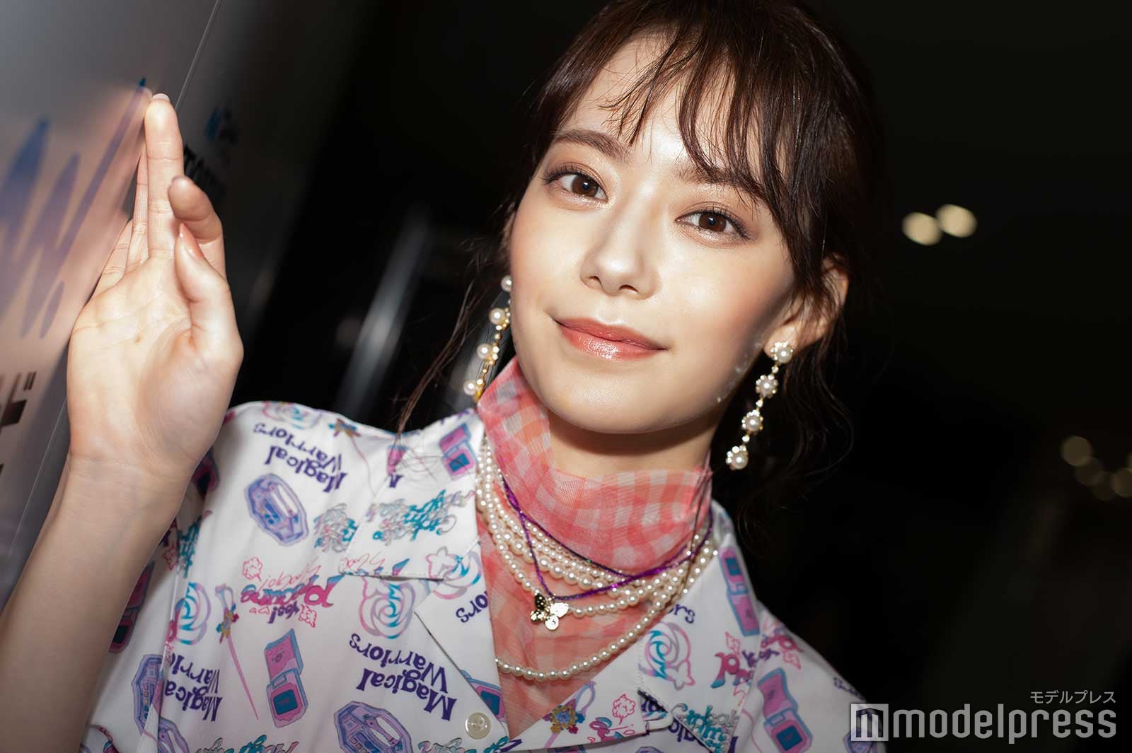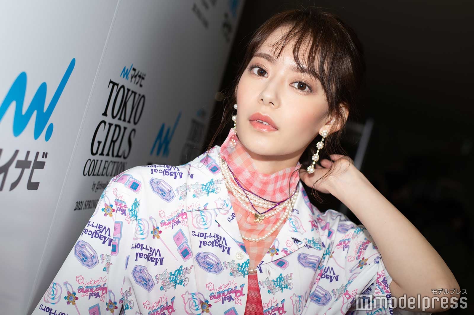 なごみはTGCがプロデュースするアパレルブランド「FANDOM8」と人気アニメ「プリキュア」のコラボステージに登場。ギンガムチェックのインナーに柄シャツを重ね着し、ビビットピンクのパンツを合わせたコーディネートを披露した。