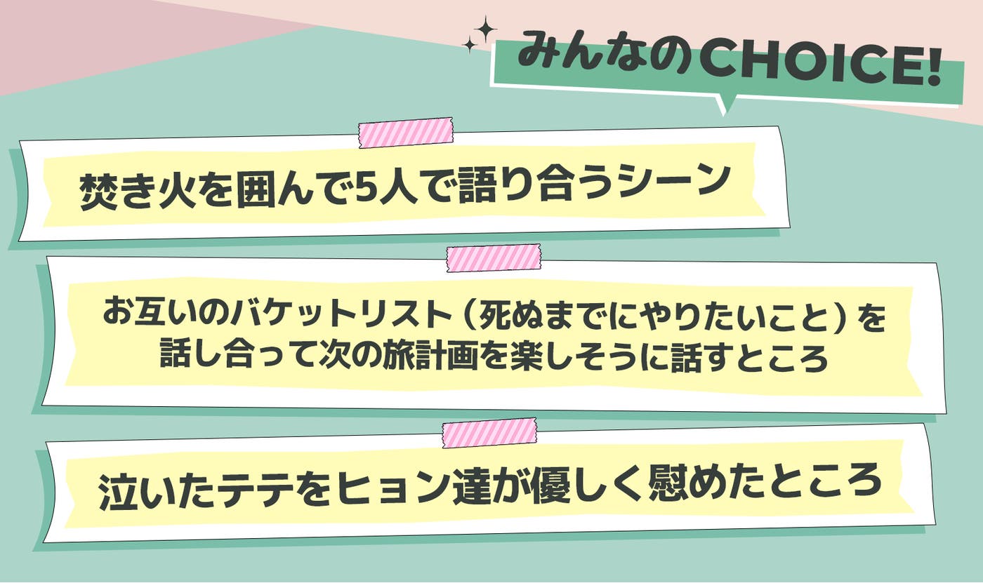 ・「それぞれがリスペクトしている事を語った焚き火のシーン!本当に5人の仲が良いことが伝わってきた」