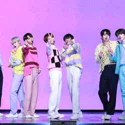 ENHYPENは、BTSが所属するHYBEと総合コンテンツ大手CJ ENMの合作法人BELIFT LABによる超大型プロジェクト「I-LAND」にて誕生したグローバルボーイズグループ。JUNGWON(リーダー)、HEESEUNG、JAY、JAKE、SUNGHOON、SUNOO、NI-KIの7人が昨年11月に『BORDER : DAY ONE』でデビューを果たし、5ヶ月ぶりにミニ2ndアルバム『BORDER : CARNIVAL』を発表&初めてのカムバックを果たした。リーダーのJUNGWONは「5ヶ月ぶりにカムバックすることになりました。思ったより緊張しますが、頑張ります」と意気込み。髪色を鮮やかなピンクパープルにしたNI-KIも、韓国語と日本語で「オフラインで記者の方を目の前にすると緊張します」と初めてのオフラインでのショーケースに緊張している様子だった。