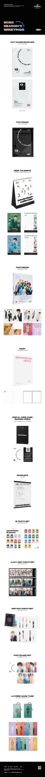 「SEVENTEEN 2022 SEASON'S GREETINGS」は、104ページにおよぶフォトブック、デスクカレンダー、ダイアリー、IDフォト、4カットユニットフォト、インスタントフォト、フォトカード、ランダムのレイヤードタグのほか、いつでもどこでもWeverseにて高画質のVODを視聴できるデジタルコードも封入されている。