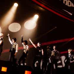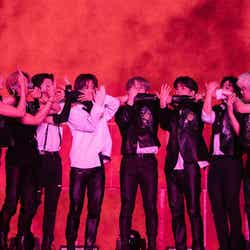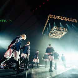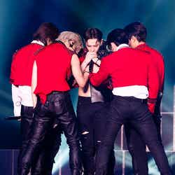 続いて真っ赤な照明の中パフォーマンスする「Red Lights」では、メンバーがメインステージ上部の装置と首を繋がれたまま、囚われたようにダンス。この妖艶な演出ダンスは、メンバー屈指の美的センスの持ち主ヒョンジンが考案したという。