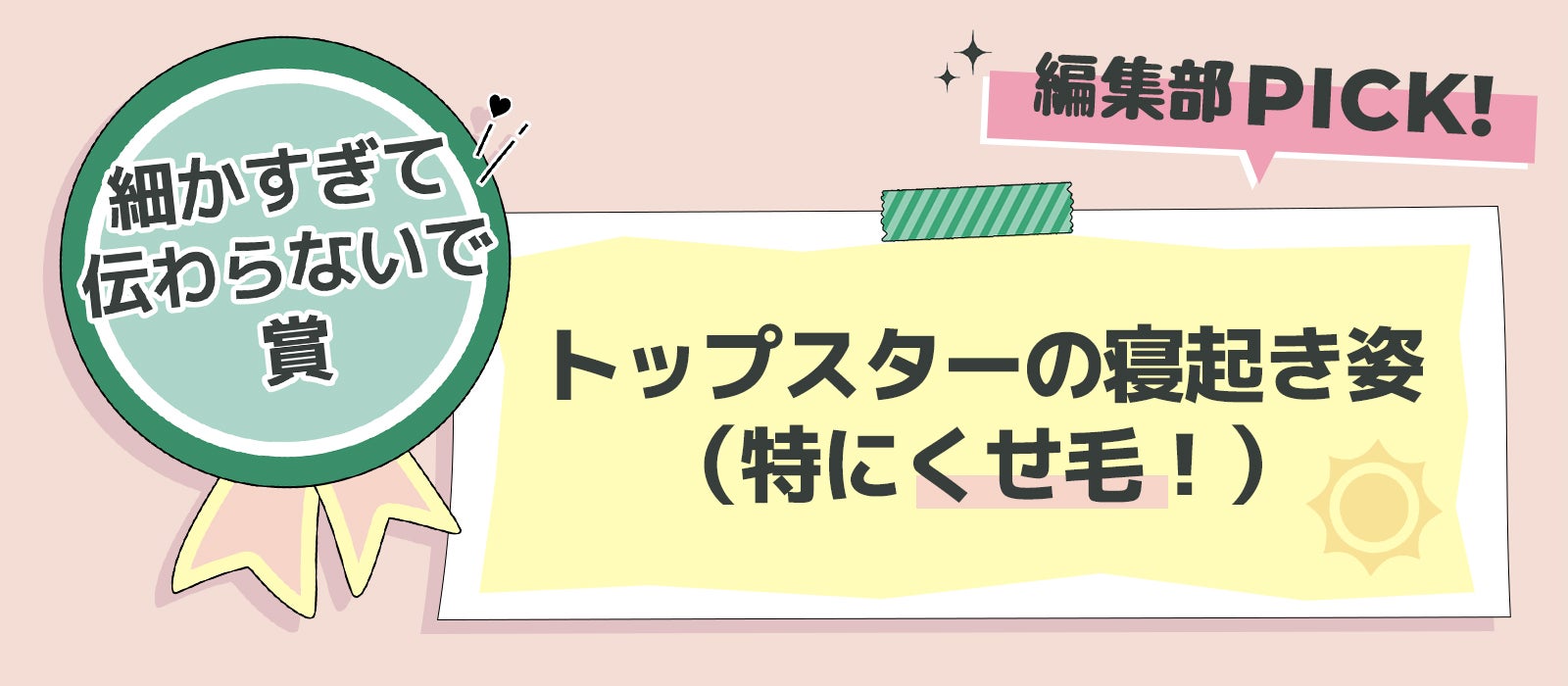 普段はヘアメイクをばっちり決めた姿を見ることが多いからこそ、フレンドケーションで披露したトップスターのありのままの姿はどれも貴重映像。髪がボサボサなのにそれすら愛おしい…と、ファンだからこそ心を掴まれていた5人の寝起き姿を、「細かすぎて伝わらないで賞」に決定!テテのボリューム満点の寝ぐせや、ウシクのピンと立った寝ぐせと、個性あふれるヘアスタイルはもちろん、まだ意識がぼーっとしている状況での絡みも見逃せません。