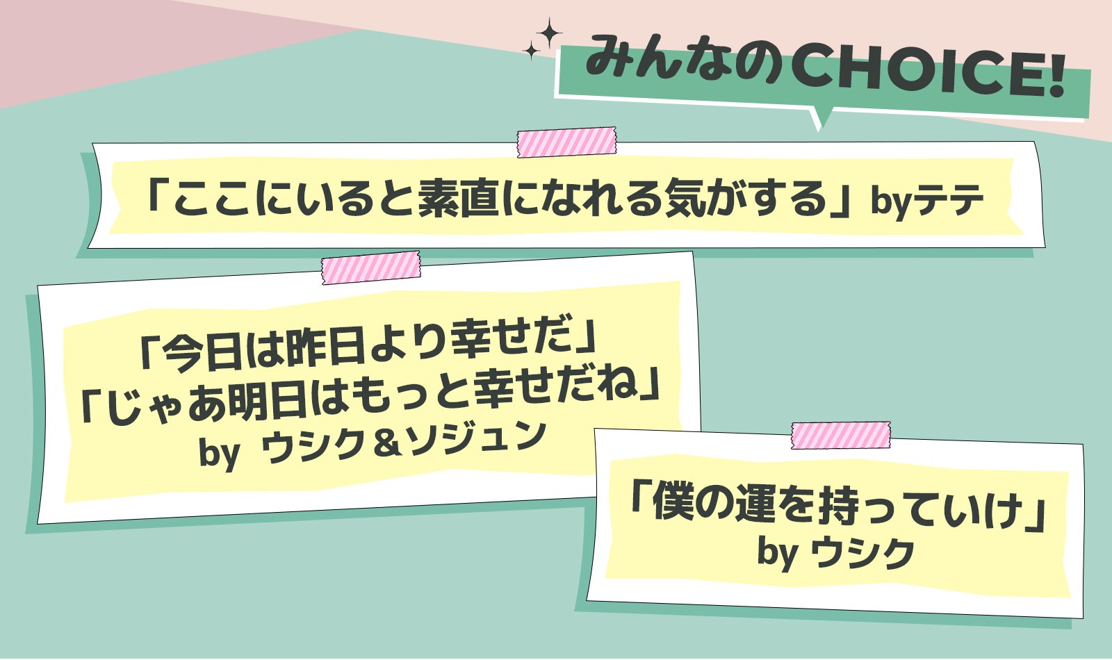 中学の同級生でもあるソジュンとPeakboy。音楽の世界での活躍を夢見ながら、ステージにも立てず落ち込んでいた時、一度だけソジュンに悩みを吐露したことがあったそう。そのときにPeakboyに贈ったのが、「花には咲く時期がある」「頑張ってるから花開く時がくるよ」という言葉。機材のためにバイトをしたり、親に頼らずに頑張っていた姿をそばで見守っていたからこそ、投げかけた言葉には、表面上の慰めではない深い愛情があったはず。Peakboyも「その言葉のおかげですごく励まされた」と振り返り、2人の絆を感じさせる瞬間でもありました。「凄く心に染みます」「私に言われた様な気がした」「優しさに溢れた励ましの言葉」と、胸を打った言葉としてダントツの結果に。