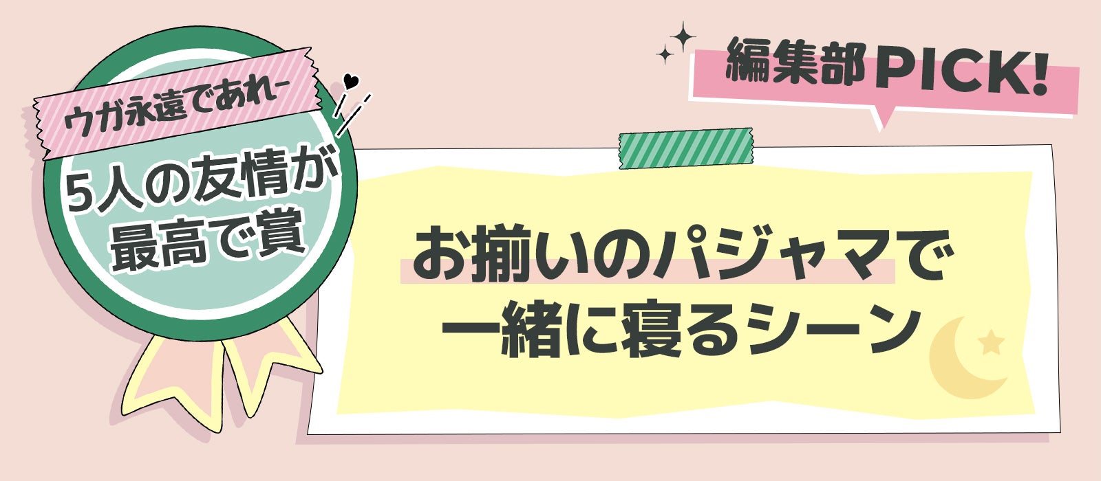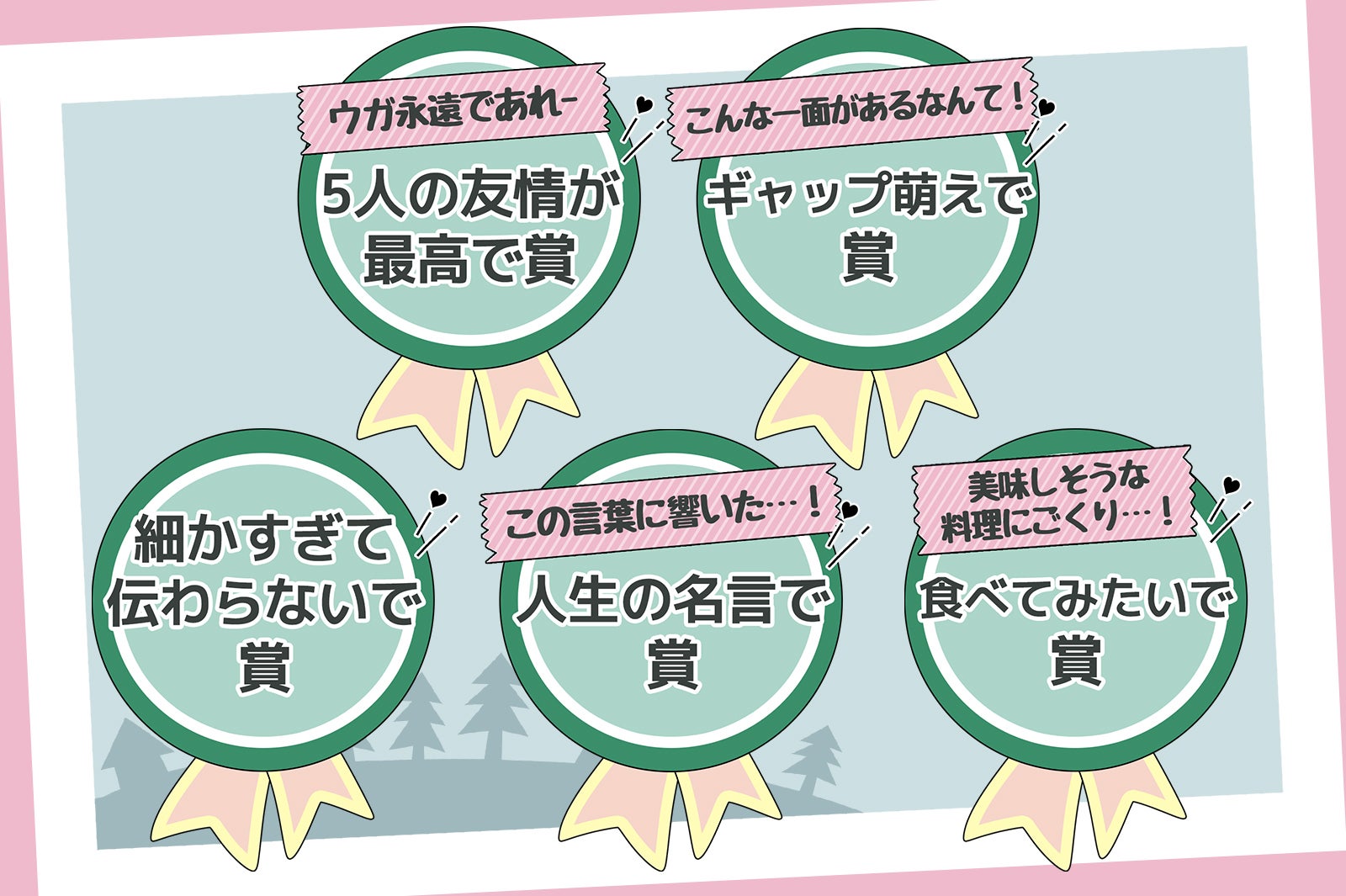 SNSでの推し場面の投稿も盛り上がる中、モデルプレスが投票を行ったのは「ウガ永遠であれ― 5人の友情が最高で賞」「こんな一面があるなんて!ギャップ萌えで賞」「細かすぎて伝わらないで賞」「この言葉に響いた…!人生の名言で賞」「美味しそうな料理にごくり…!食べてみたいで賞」の5つ。全4話から選ばれたシーンとは―?ウガ永遠であれ― 5人の友情が最高で賞