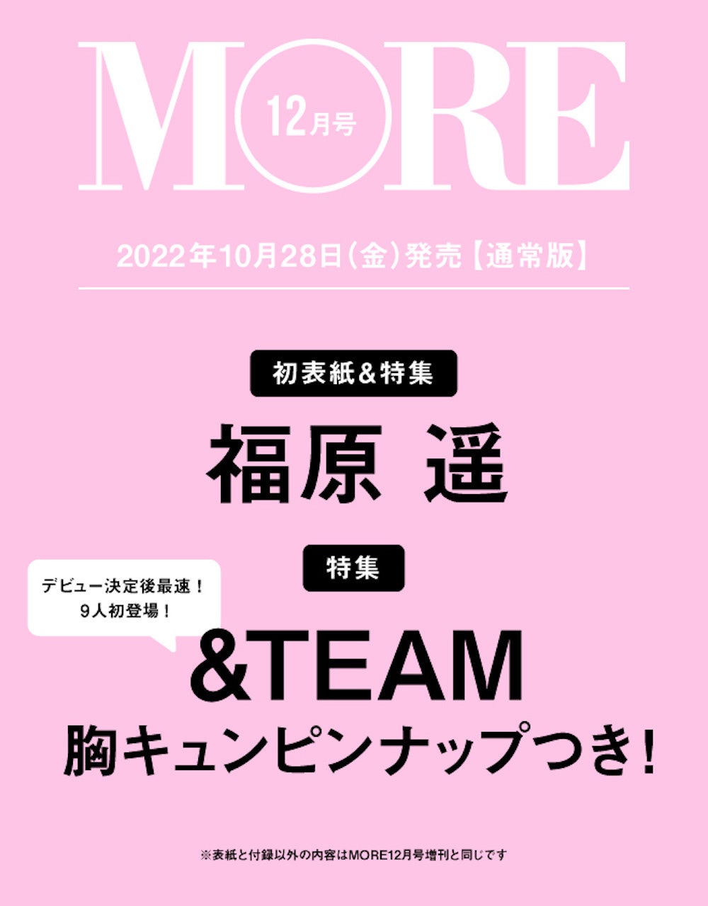 世界的な人気を誇るBTS、SEVENTEEN、TOMORROW X TOGETHER、ENHYPEN、fromis_9、LE SSERAFIM、NewJeans などのアーティストが所属する様々なレーベルを擁するHYBE。その日本本社HYBE JAPANおよびHYBE LABELS JAPANによる日本を皮切りにグローバルを舞台に活躍するアーティストを生み出すオーディション番組『&AUDITION - The Howling -』から生まれた&TEAM。12月7日にデビューシングルのリリースが決定した彼らが、最速で「MORE」12月号増刊の表紙に初登場。増刊では、スマホケースにもはさめる&TEAMメンバーのスペシャル厚紙カード、福原遥が表紙を務める「MORE」12月号通常版には&TEAMメンバーのクールでおしゃれな表情が楽しめるピンナップが付録となっている。(modelpress編集部)