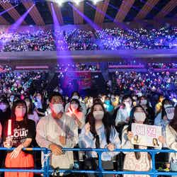 TWICE(トゥワイス)やITZY(イッジ)の所属するJYPエンターテインメントの新たなガールズグループとして2022年にデビューした同グループは今回が初の来日ステージ。新曲「DICE」でステージの幕を開き、優雅かつ不思議な世界観で会場を魅了すると、クールなパフォーマンスから一変した可愛らしい挨拶を行った。1人ずつ日本語で挨拶すると、リーダーのHAEWON(ヘウォン)は「NMIXXのステージが素敵な思い出として心に残れば幸いです。これからもNMIXXのことを見守ってくださいね」と流暢な日本語で呼びかけ。その後は全員で声を揃えて「そしてたくさんの愛をお願いします!」と笑顔で伝え、観客の視線を集めた。