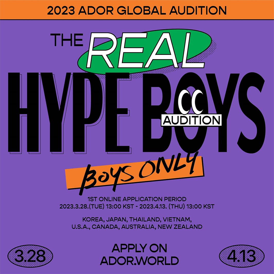 ADORは28日、公式ホームページに「2023 ADOR Global Audition - The Real Hype Boys -(2023 アドア・グローバルオーディション - ザ・リアル・ハイプボーイズ -)」開催の案内を掲載。募集対象は2004年~2012年生まれの男性。志願者は個人またはチームとして参加でき、今回のオーディションは、特に従来の応募分野から脱却しており、「歌やダンスだけでなく、分野に関わらず自身の才能をアピールして欲しい」とADOR側は説明した。