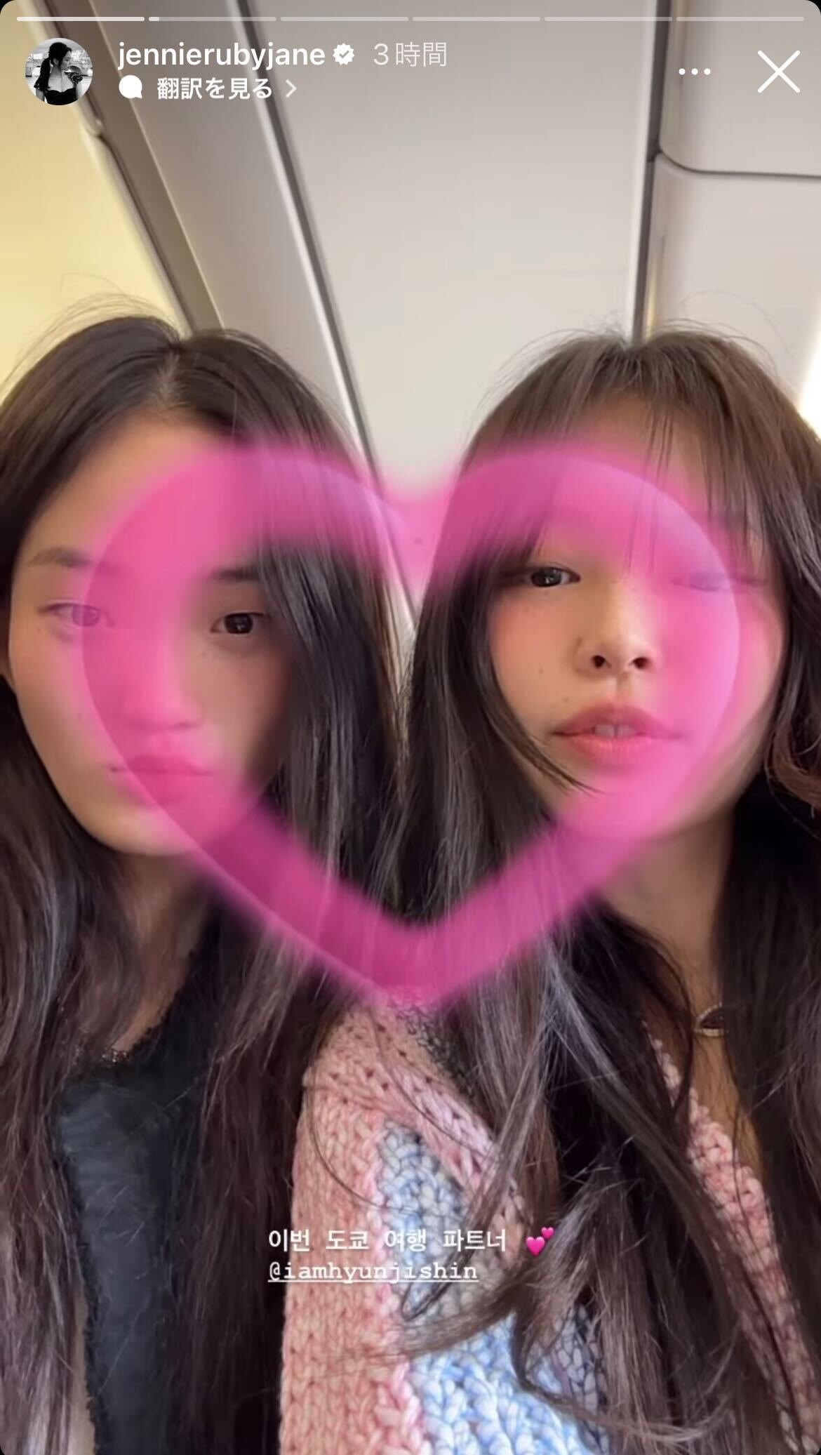 ジェニーはこの日、仲の良いモデルのシン・ヒョンジと、飛行機の中で撮影したショート動画を公開。顔を寄せ合う2人を囲むようにハートマークが浮かんでいるほか「今回の東京旅行のパートナー」と書き込まれている。さらにお茶目なフィルターで撮影した2ショット動画に「一緒だから幸せ」とコメントしたジェニー。ほかにも、2人で手のハートを作った写真などをアップし、親密さが伝わってくる。