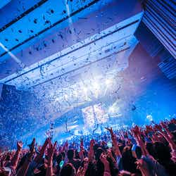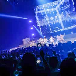 その後アンコールの声が鳴りやまず、幻想的な照明の中、サングラスをかけたウヨンが再び登場。最新アルバム収録の「From here」からアンコールステージがスタートした。最後は「Chill OUT」を披露し、「早くまた会いましょう!またね!バイバイ!みんなありがとう、サンキュー!」と告げてステージを去り、エンドロールが流れ始めた。通常のコンサートであればここで終了だが、そうはいかないのが今回の「WOOYOUNG(From 2PM)Solo Tour 2023 “Off the record”」だ。照明が暗転し、重低音のビートが鳴り響くと客席のさまざまな出入り口から突如ダンサーたちが現れ、客席内を歩いてステージ上に上がっていく。「まさか!?」と思うと、客席後方の入り口に照明が当たり、ウヨンも同じく登場、客席を歩いてステージへ。そして始まったのは「Party Shots」。激しいダンスを繰り広げ、最新アルバム収録曲「君の別の名前」でもその勢いは止まらず、「これがウヨンだよ!みんなのアイドル・ウヨンだよ!」と会場を沸かせた。