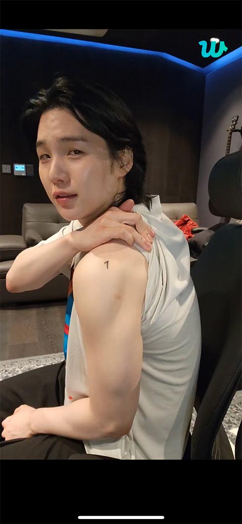 SUGAのタトゥーは「7」の数字で、これはBTSメンバーが全員お揃いで入れている“友情タトゥー”。これまでSUGA以外のメンバーは全員自身の“友情タトゥー”を公開していたが、SUGAだけは非公開になっていた。