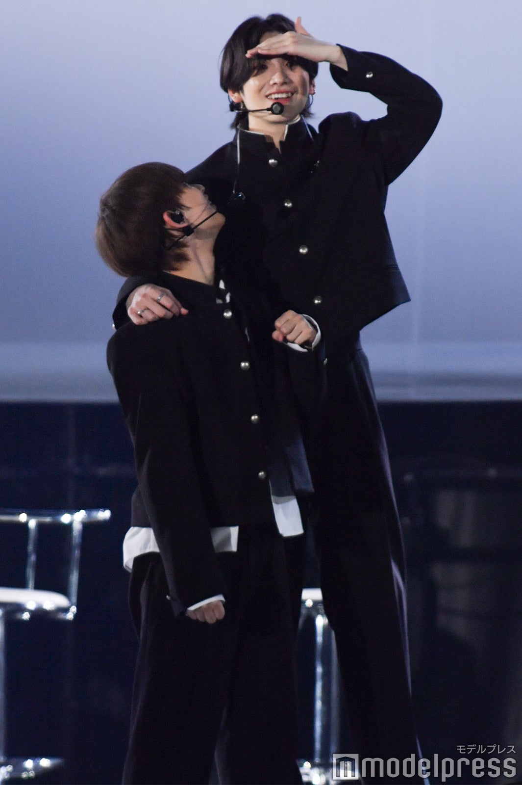 思い出を振り返るトークコーナーでは、学ランのような格好で登場したメンバーたち。JOは初めてLUNEと対面した際について、「実際に会った時に『本当に実在するんだ!』とすごくびっくりしたのを覚えています」とファンを目の前にした感動を語っていた。さらに、リーダー・EJが冠番組で取得した食レポを実践したり、初のファンミーティングでも行っていた“演劇部”の再演として、FUMA、NICHOLAS、HARUAが三角関係の恋模様を演じたりと、和気あいあいとしながら回顧。