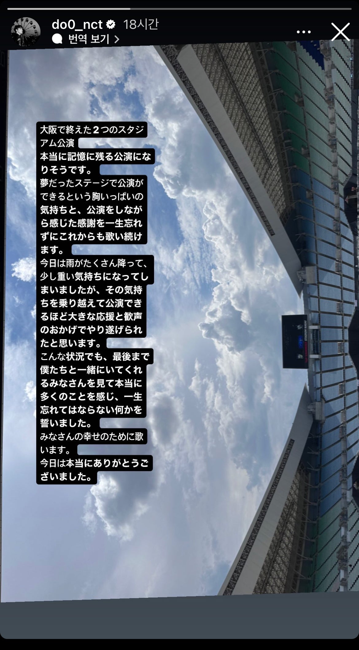 9月9~10日にわたり、大阪・ヤンマースタジアム長居で初の全体コンサート「NCT STADIUM LIVE<NCT NATION : To The World-in JAPAN>」を開催したNCT。ドヨンは2日間の公演を終え、日本語で「本当に記憶に残る公演になりそうです。夢だったステージで公演ができるという胸いっぱいの気持ちと、公演をしながら感じた感謝を一生忘れずにこれからも歌い続けます」と熱い気持ちをつづった。
