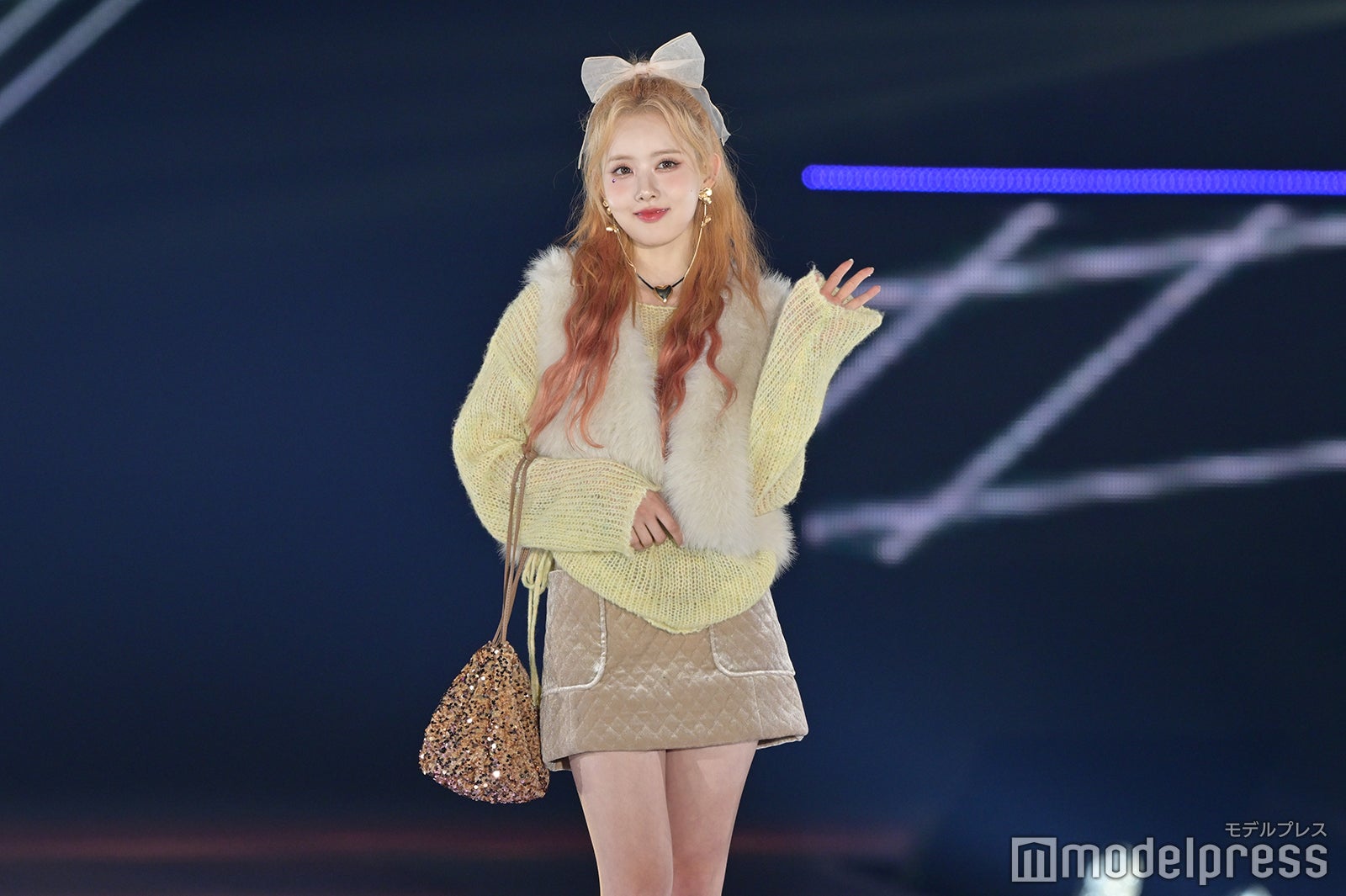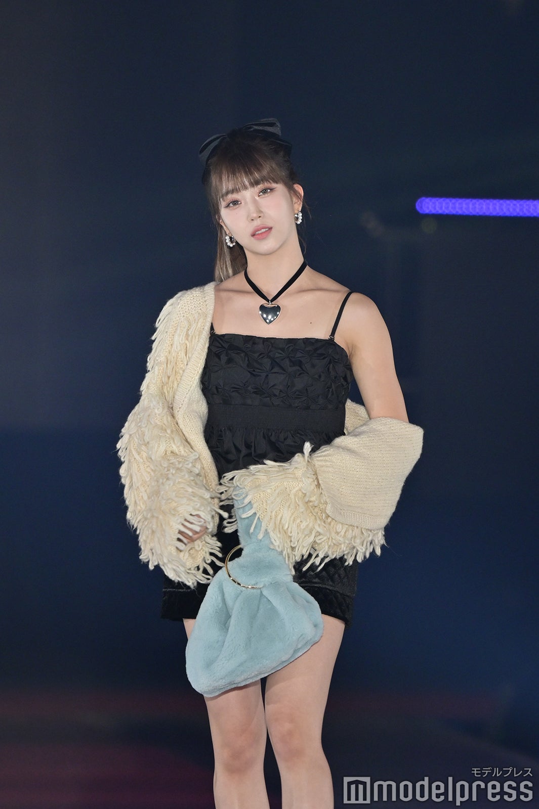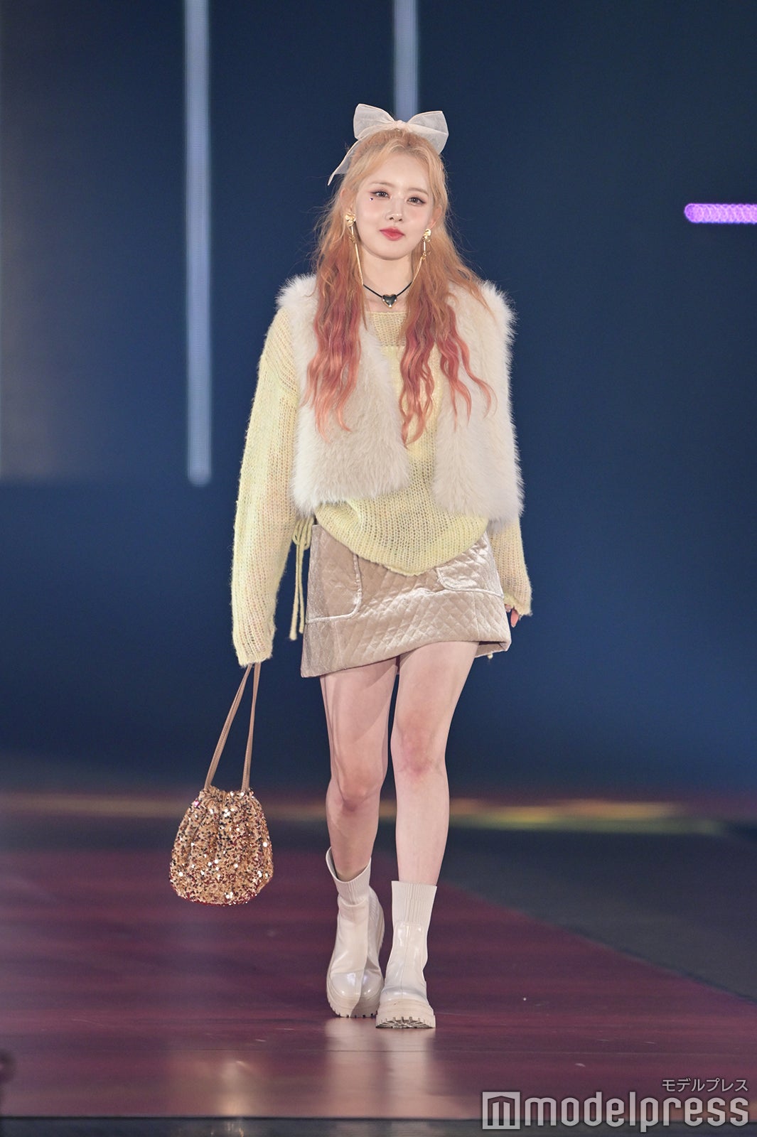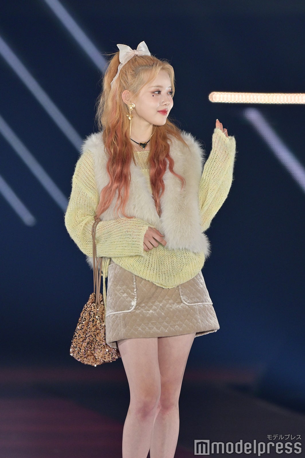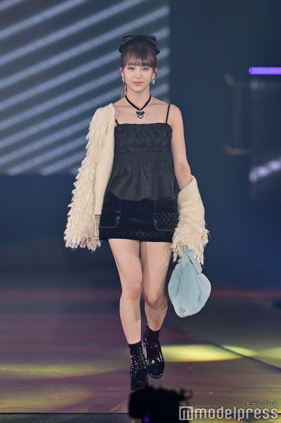 トップバッターを務めたジェイ(J)はミニ丈カーディガンにデニムを合わせ、鍛えられたウエストを披露。アイサ(ISA)は美しい黒髪をなびかせ、ブルーのカーディガンやレーストップスでガーリーなコーディネートに身を包んだ。シウン(SIEUN)は淡い黄色のメッシュニットとファーベストを組み合わせ、スミン(SUMIN)は大きなリボンを身につけたポニーテールを揺らし、観客に手を振りながら笑顔でランウェイを闊歩。セウン(SEEUN)は、首元に巻いたマフラーを使い可愛らしくポージングを決めた。