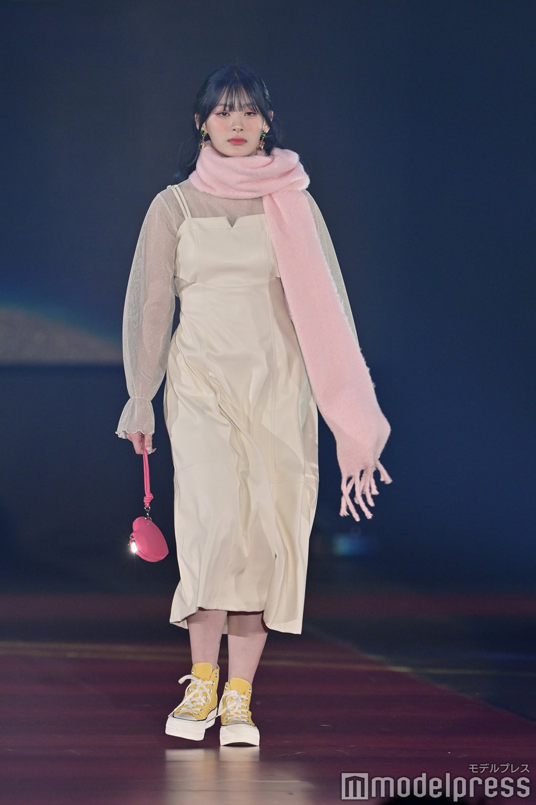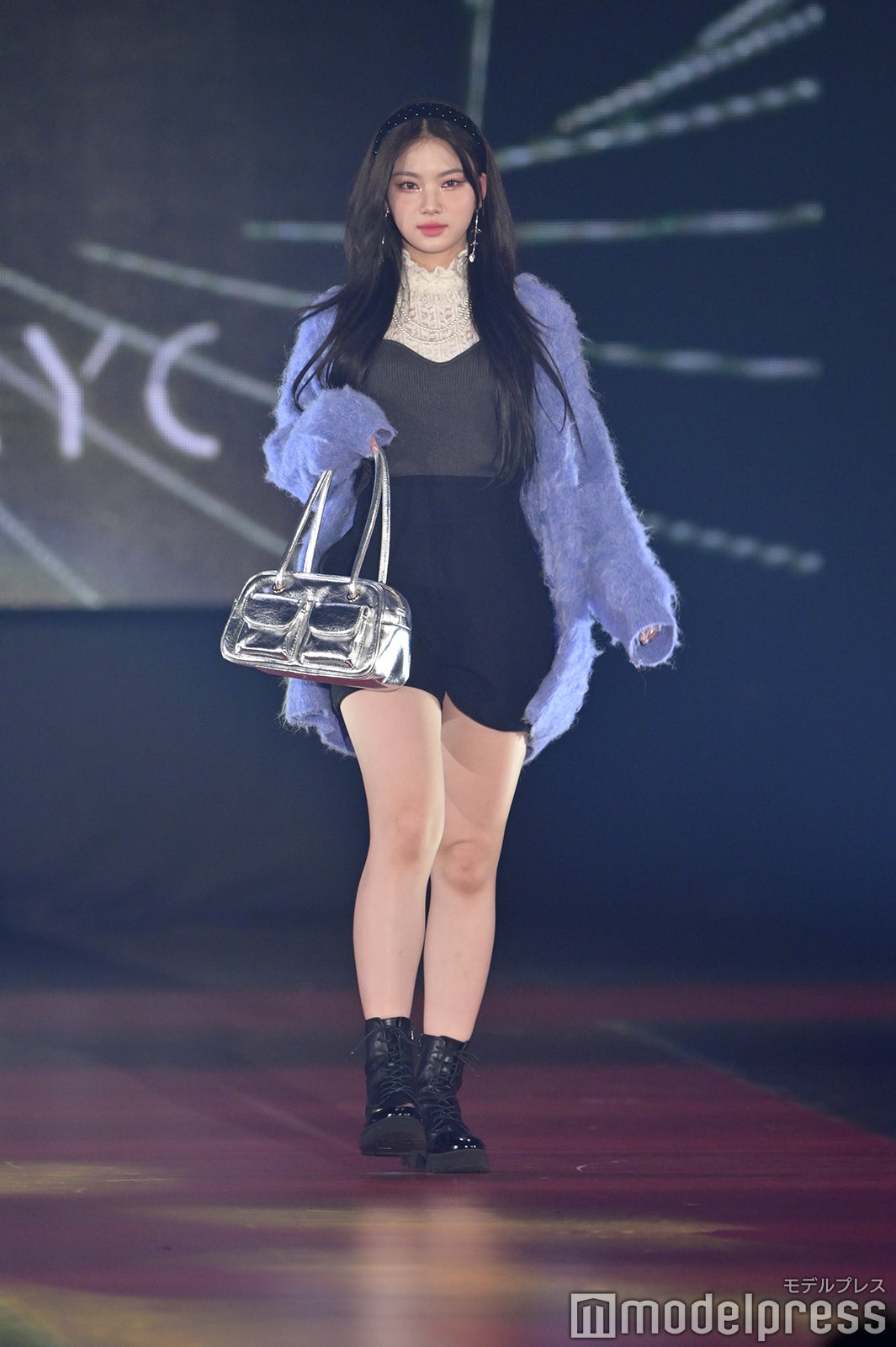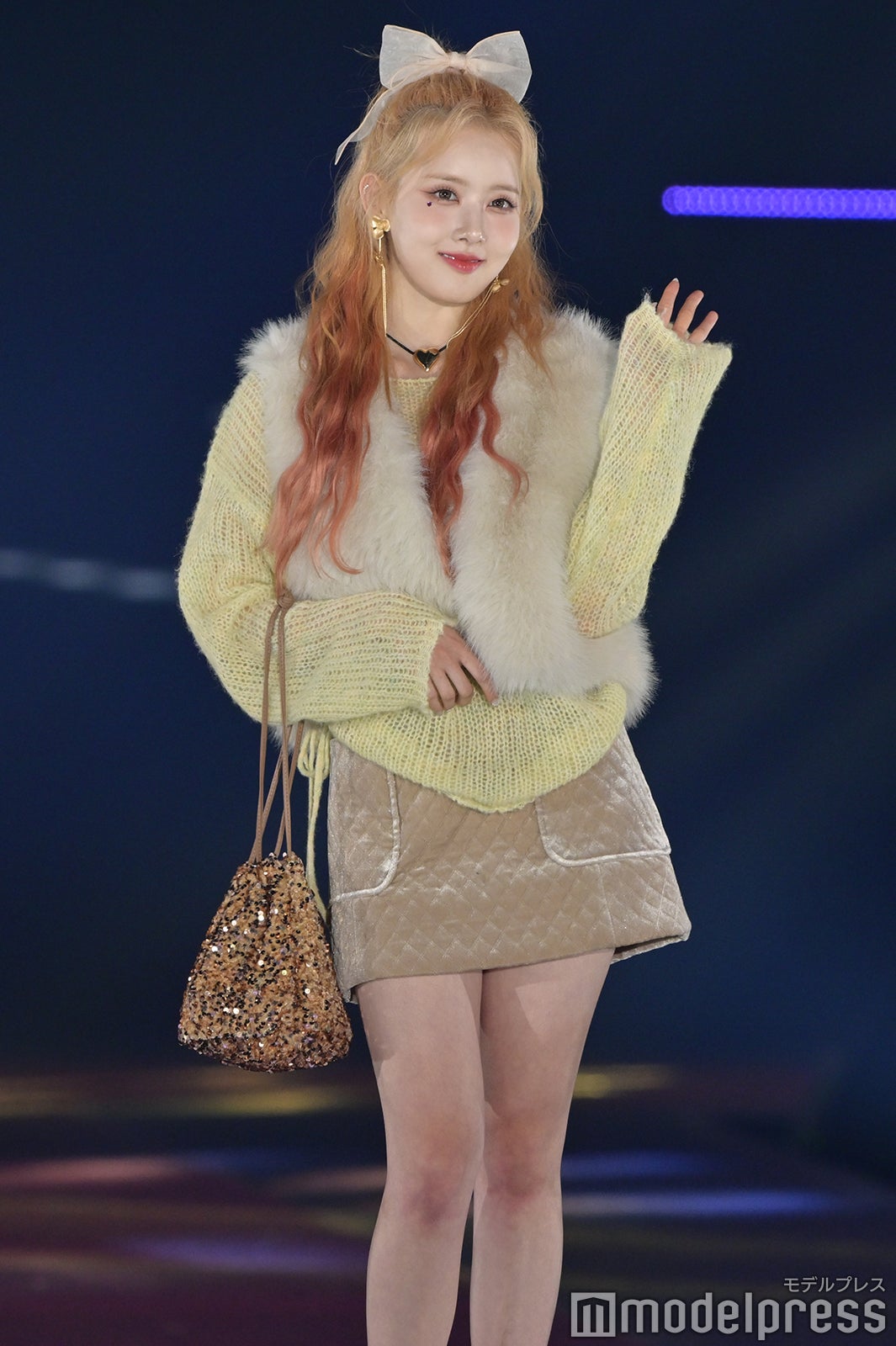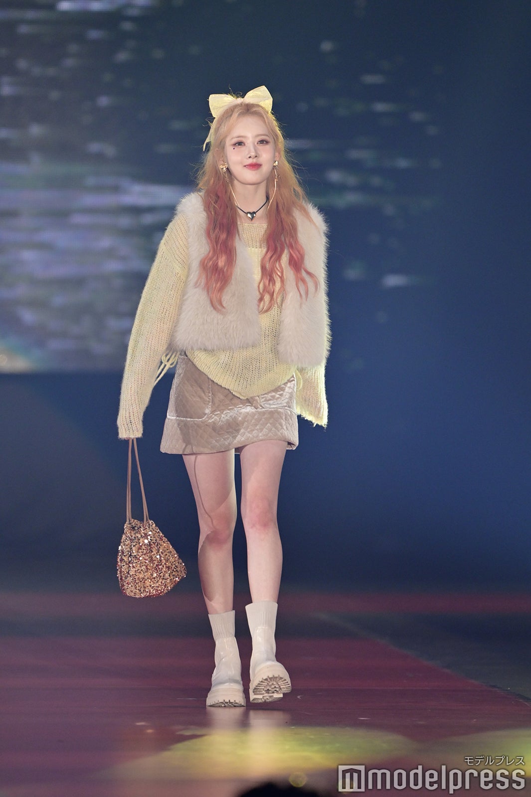 トップバッターを務めたジェイ(J)はミニ丈カーディガンにデニムを合わせ、鍛えられたウエストを披露。アイサ(ISA)は美しい黒髪をなびかせ、ブルーのカーディガンやレーストップスでガーリーなコーディネートに身を包んだ。シウン(SIEUN)は淡い黄色のメッシュニットとファーベストを組み合わせ、スミン(SUMIN)は大きなリボンを身につけたポニーテールを揺らし、観客に手を振りながら笑顔でランウェイを闊歩。セウン(SEEUN)は、首元に巻いたマフラーを使い可愛らしくポージングを決めた。