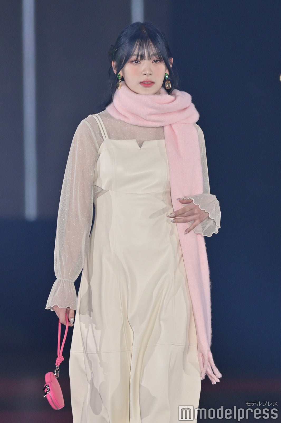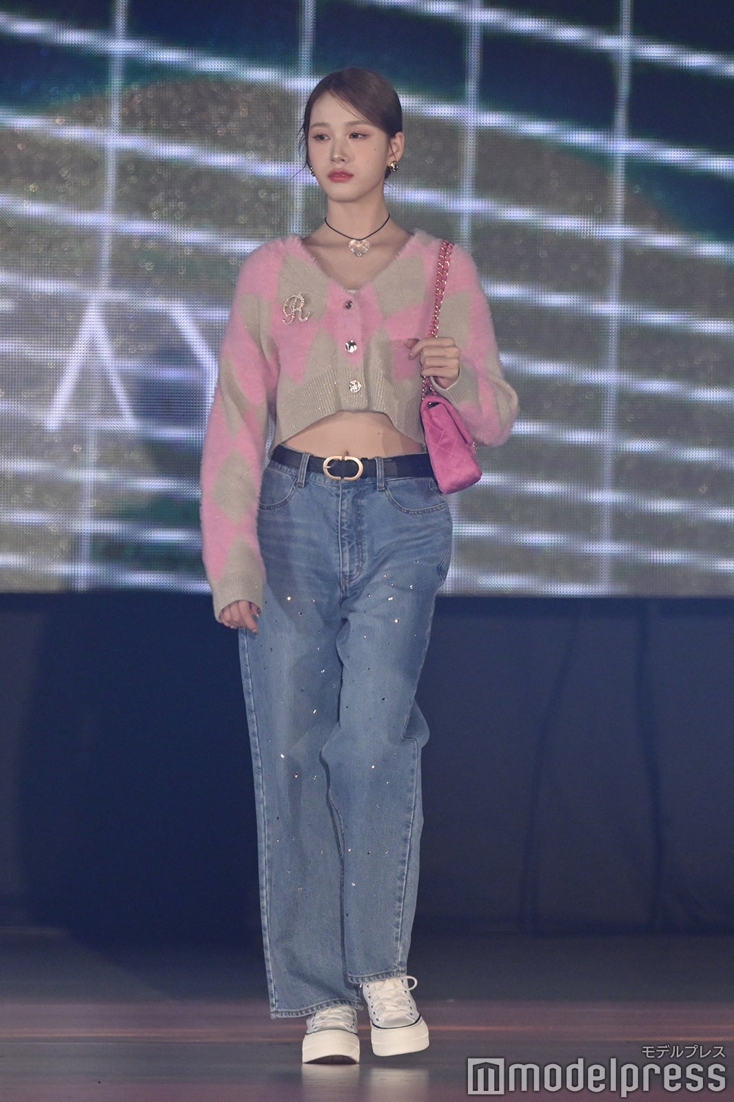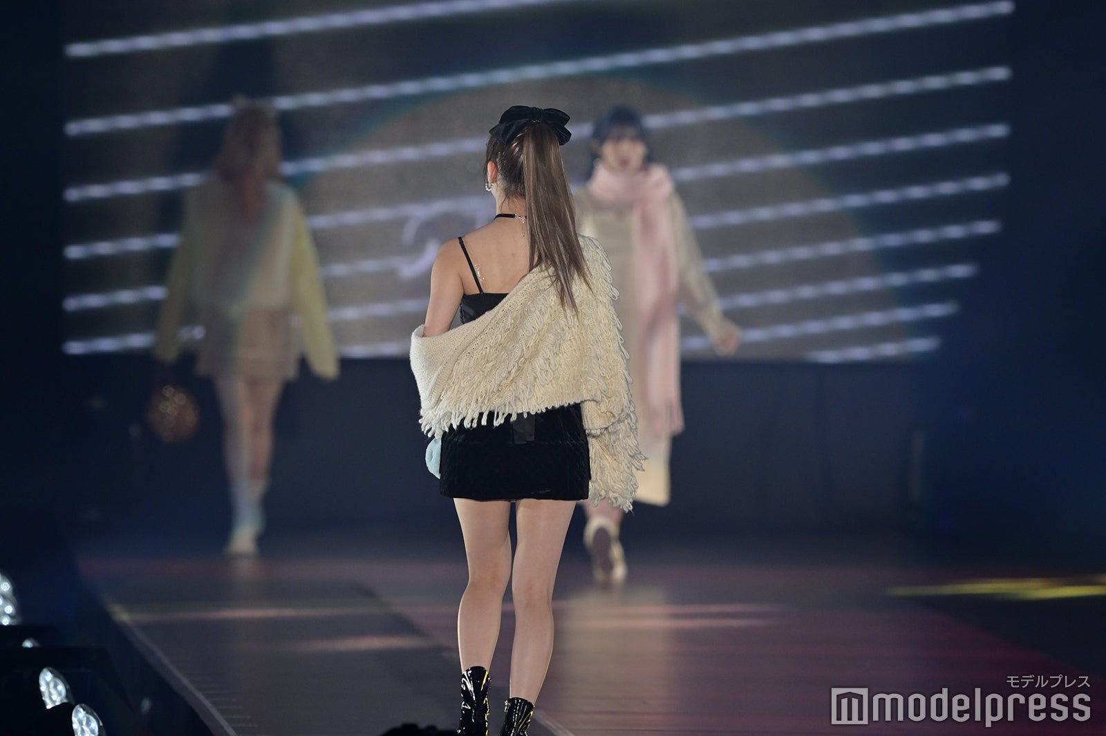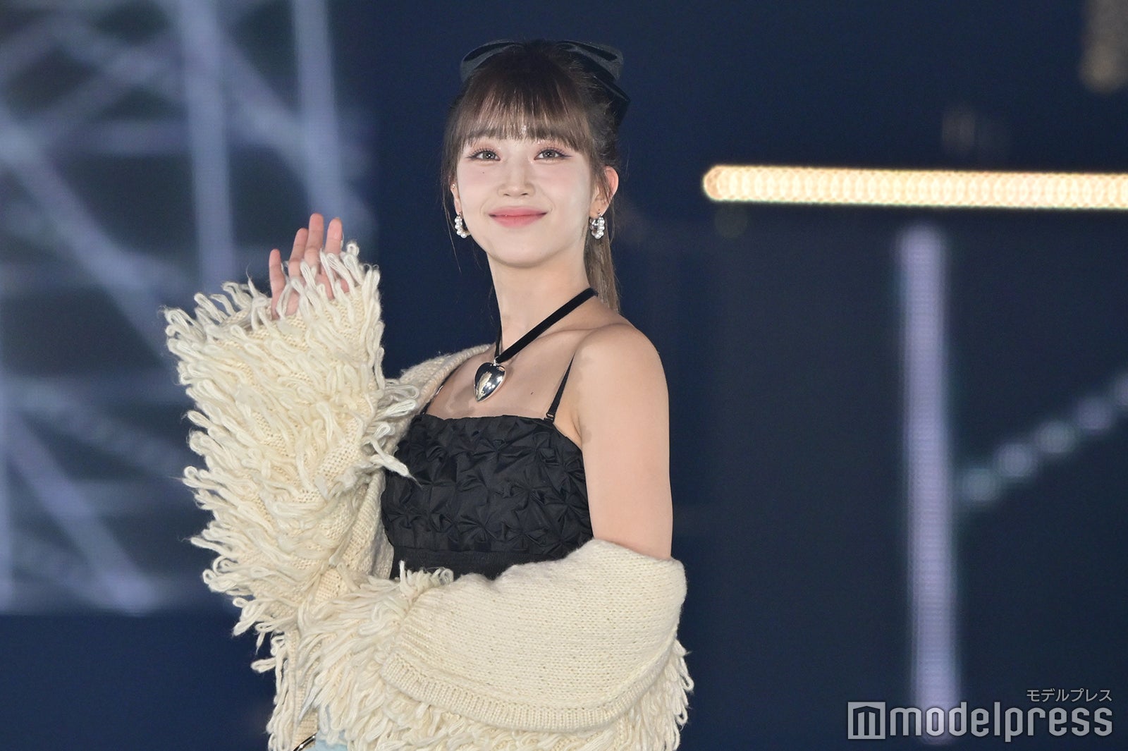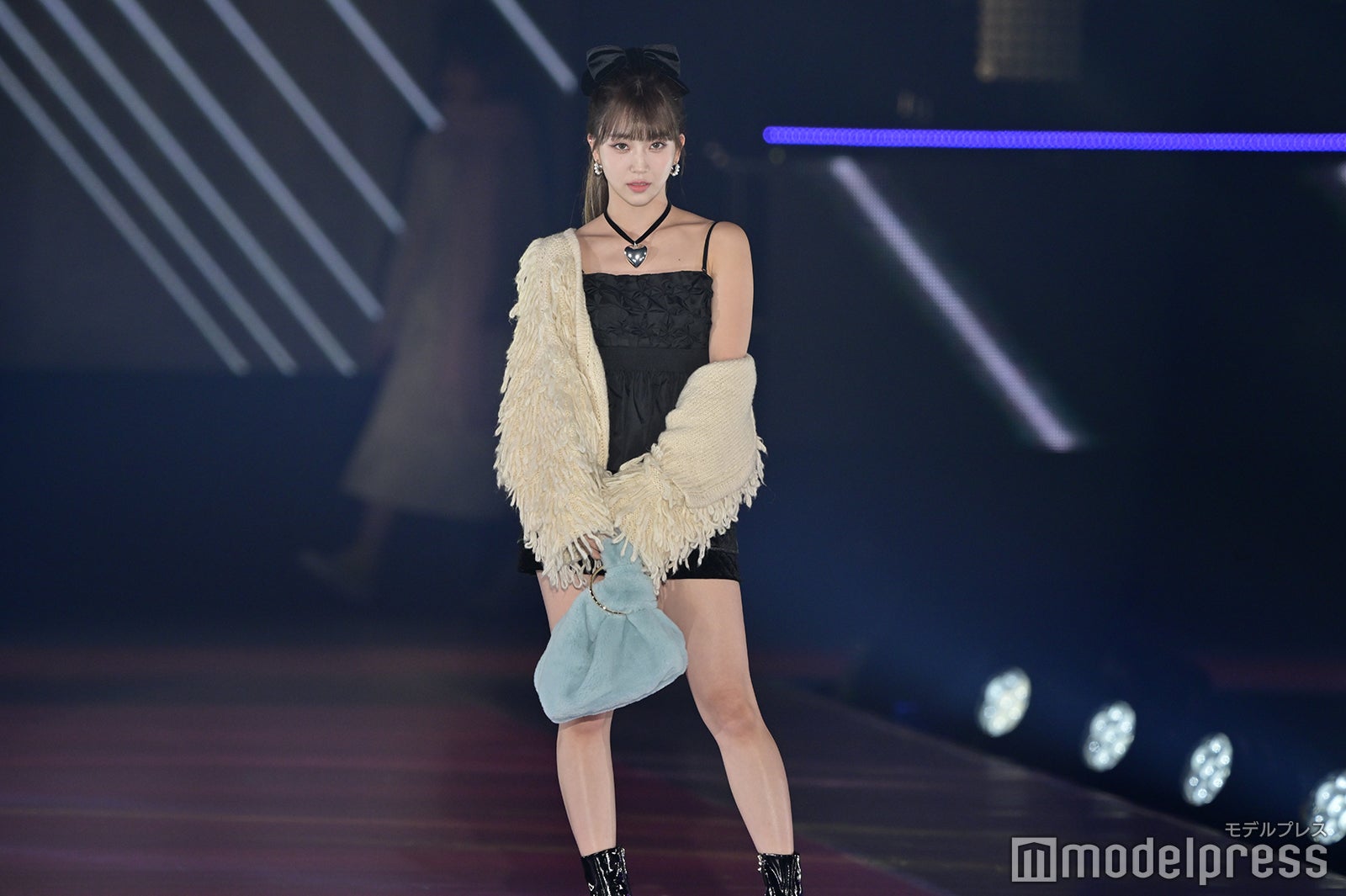 トップバッターを務めたジェイ(J)はミニ丈カーディガンにデニムを合わせ、鍛えられたウエストを披露。アイサ(ISA)は美しい黒髪をなびかせ、ブルーのカーディガンやレーストップスでガーリーなコーディネートに身を包んだ。シウン(SIEUN)は淡い黄色のメッシュニットとファーベストを組み合わせ、スミン(SUMIN)は大きなリボンを身につけたポニーテールを揺らし、観客に手を振りながら笑顔でランウェイを闊歩。セウン(SEEUN)は、首元に巻いたマフラーを使い可愛らしくポージングを決めた。