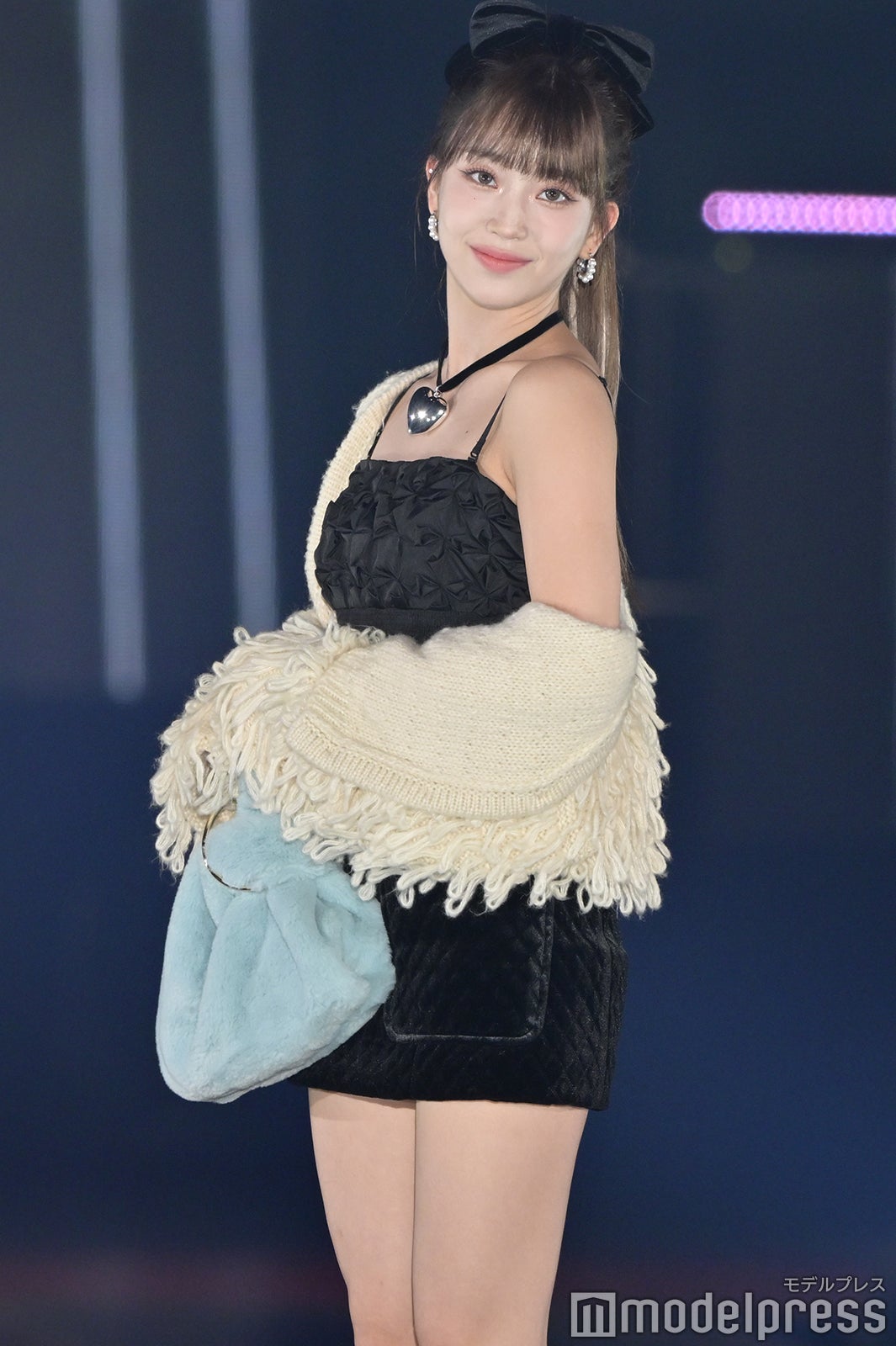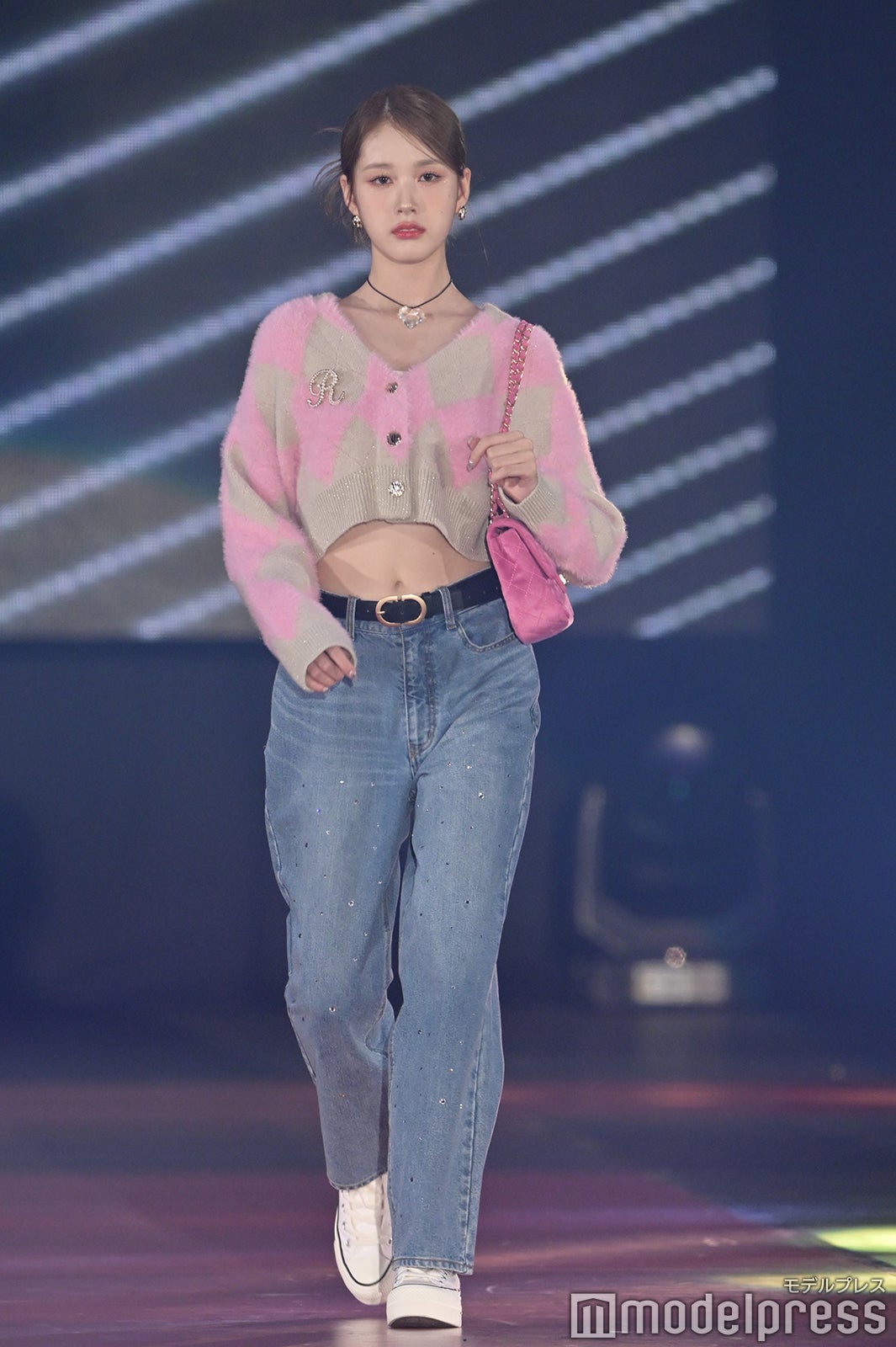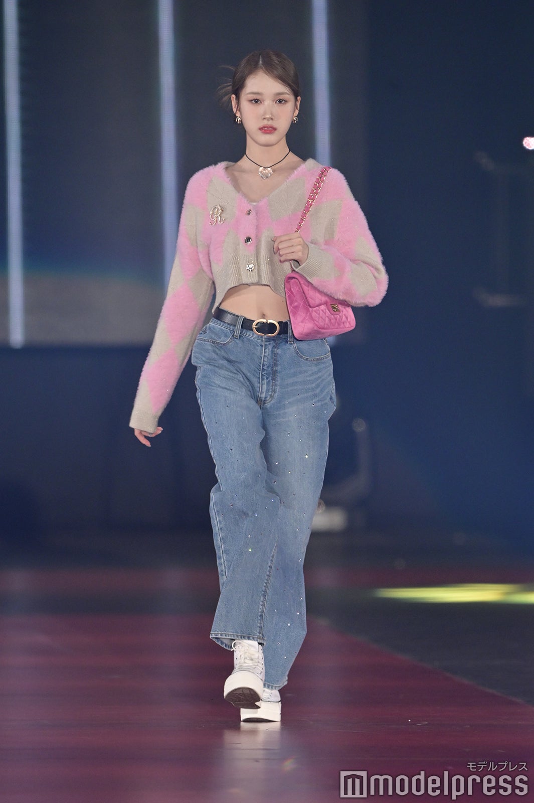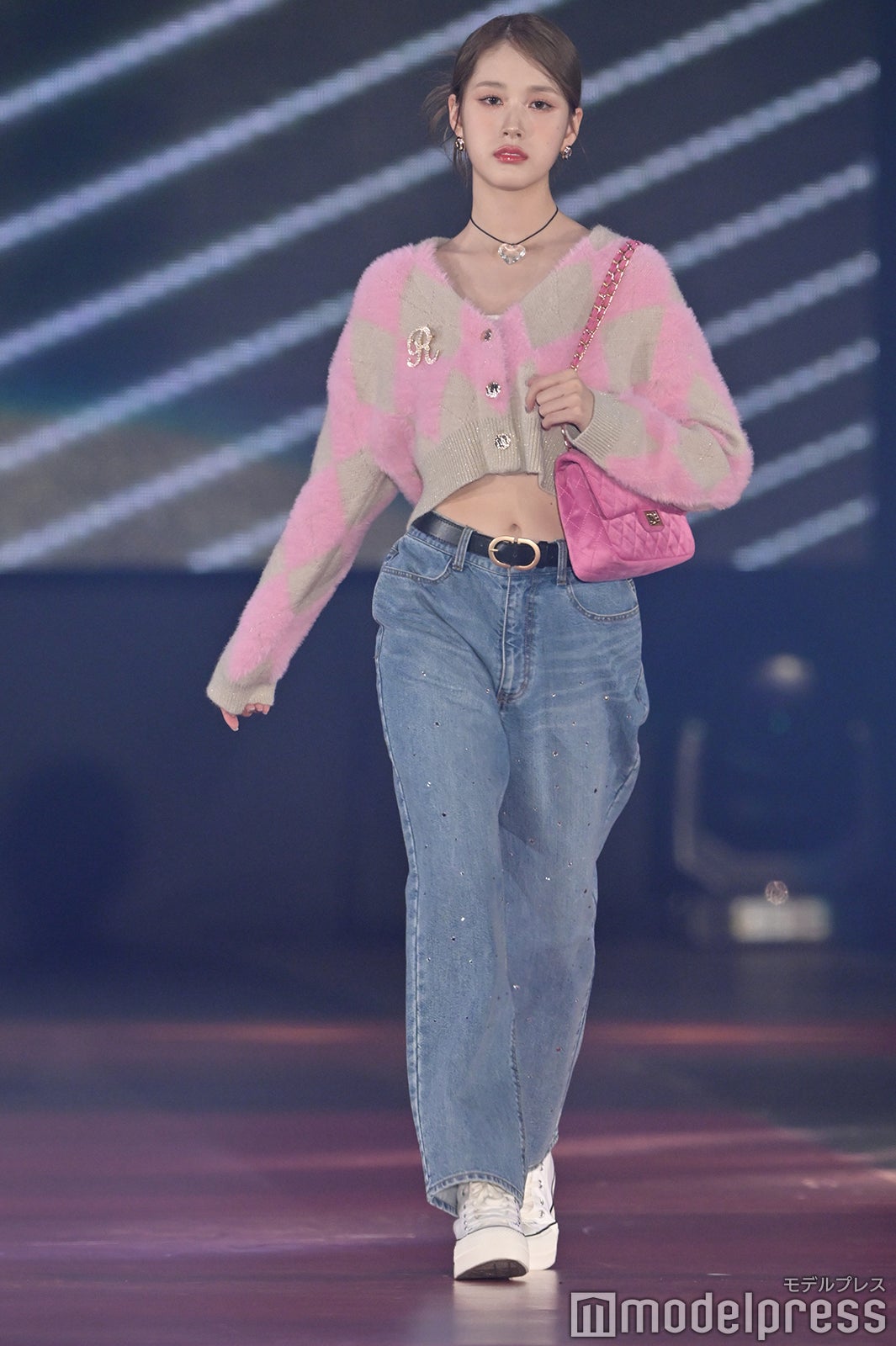 トップバッターを務めたジェイ(J)はミニ丈カーディガンにデニムを合わせ、鍛えられたウエストを披露。アイサ(ISA)は美しい黒髪をなびかせ、ブルーのカーディガンやレーストップスでガーリーなコーディネートに身を包んだ。シウン(SIEUN)は淡い黄色のメッシュニットとファーベストを組み合わせ、スミン(SUMIN)は大きなリボンを身につけたポニーテールを揺らし、観客に手を振りながら笑顔でランウェイを闊歩。セウン(SEEUN)は、首元に巻いたマフラーを使い可愛らしくポージングを決めた。