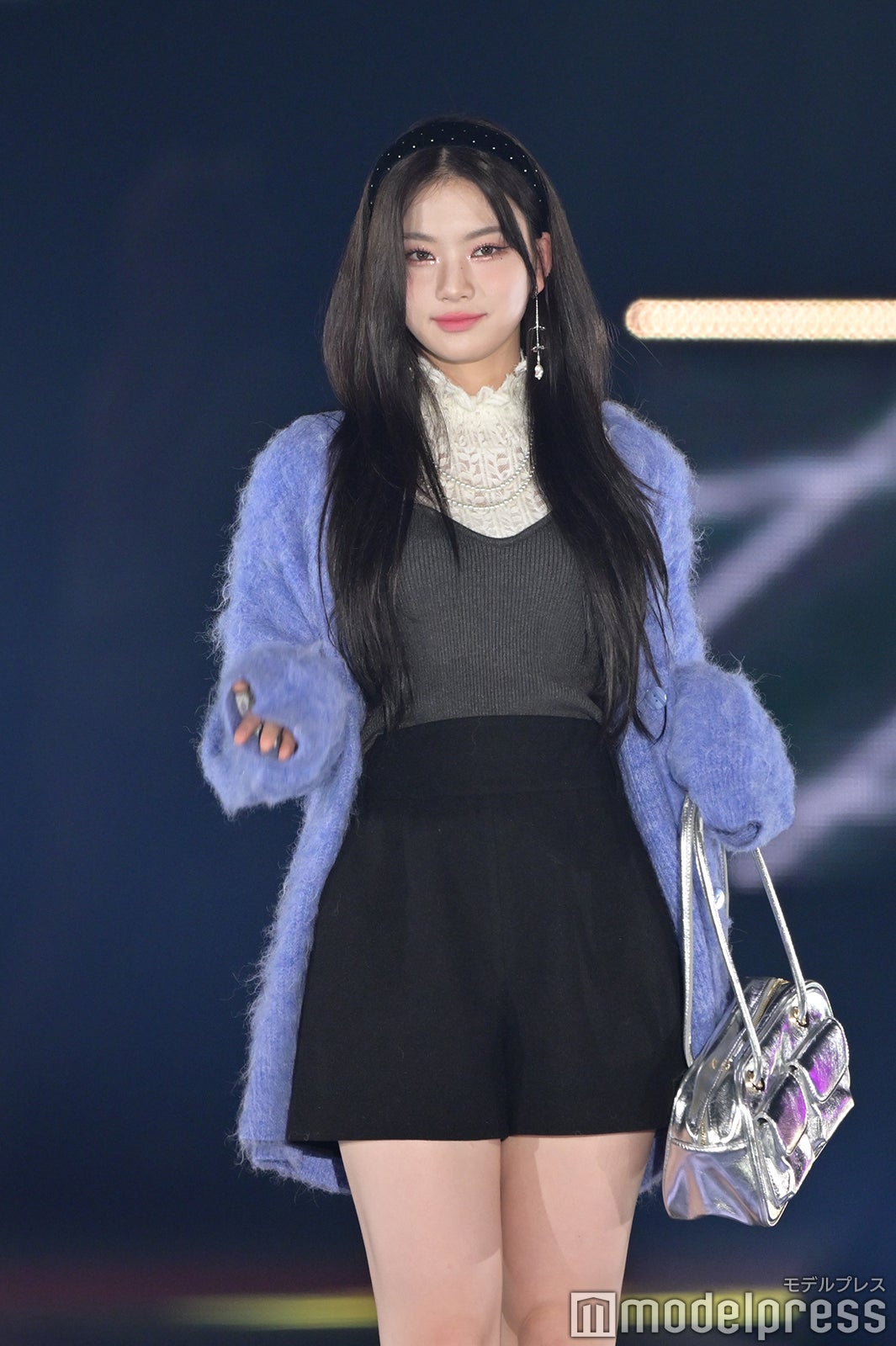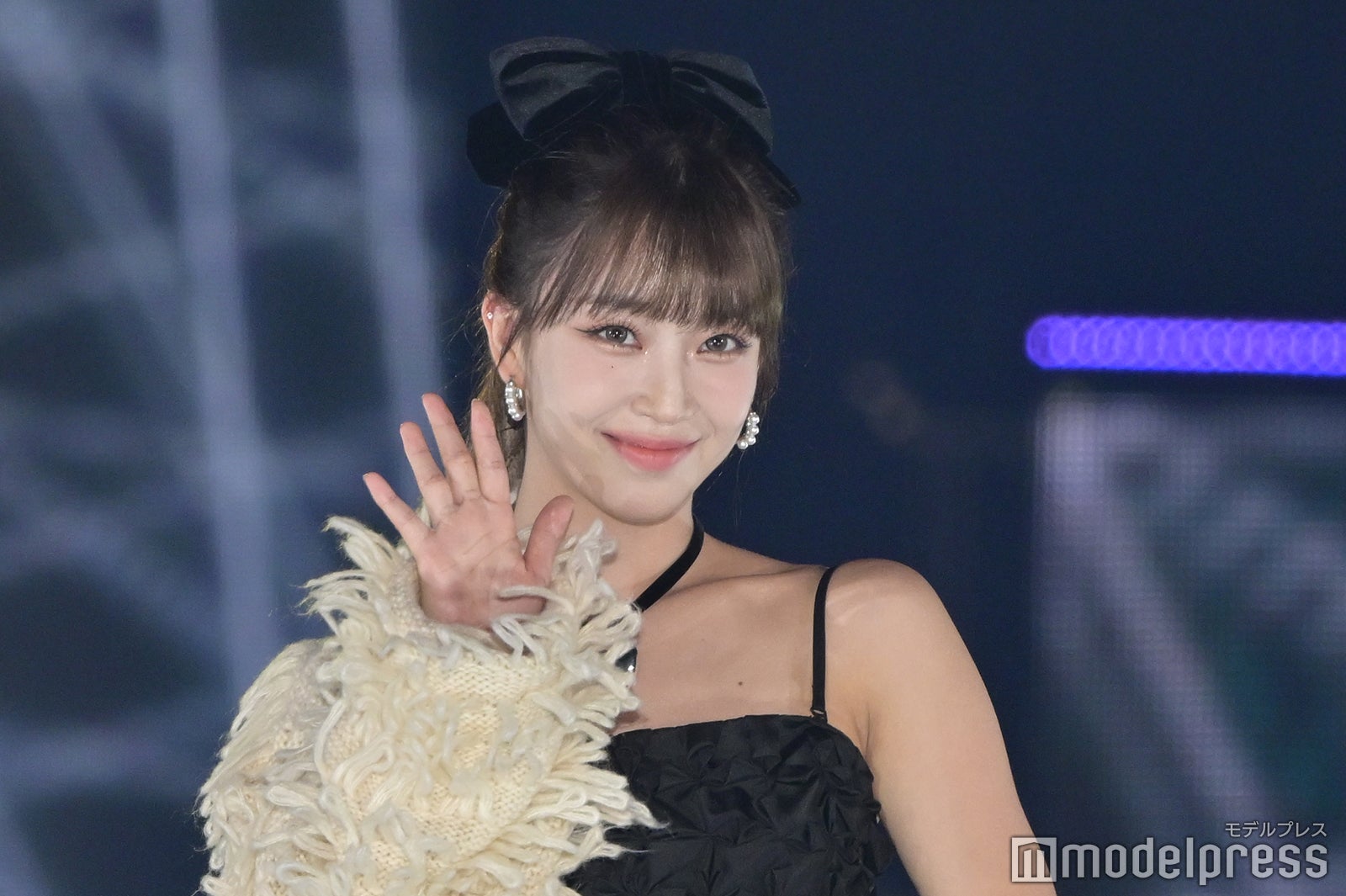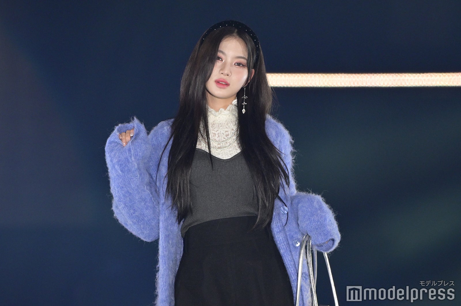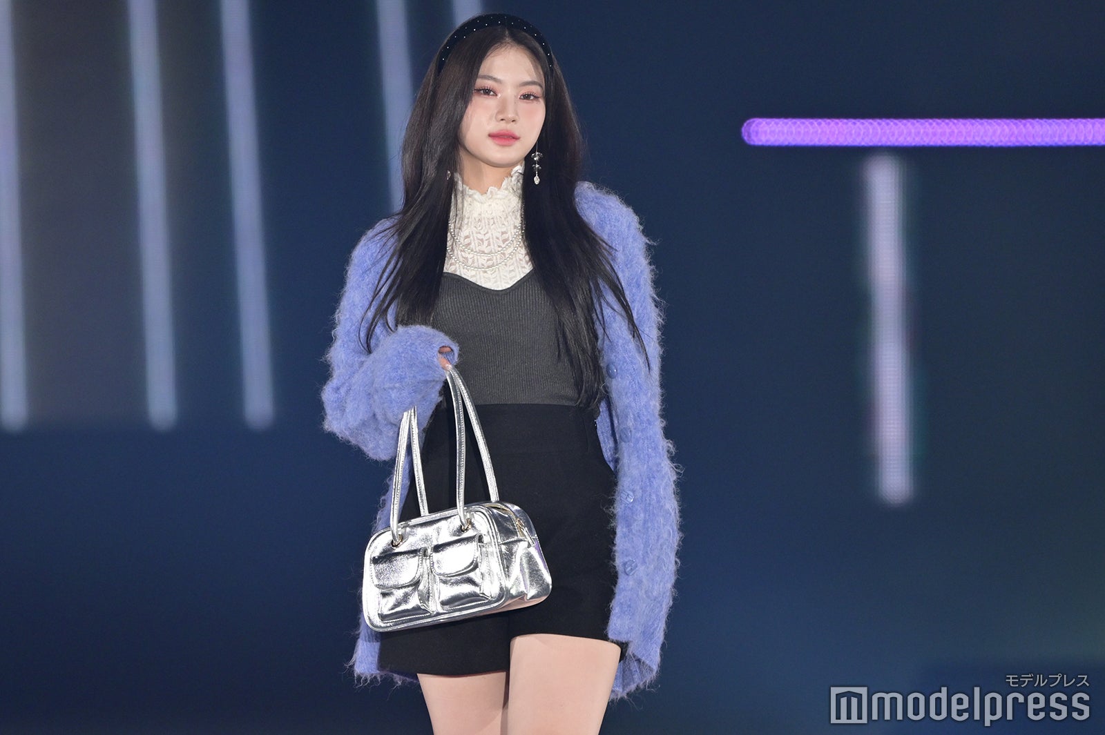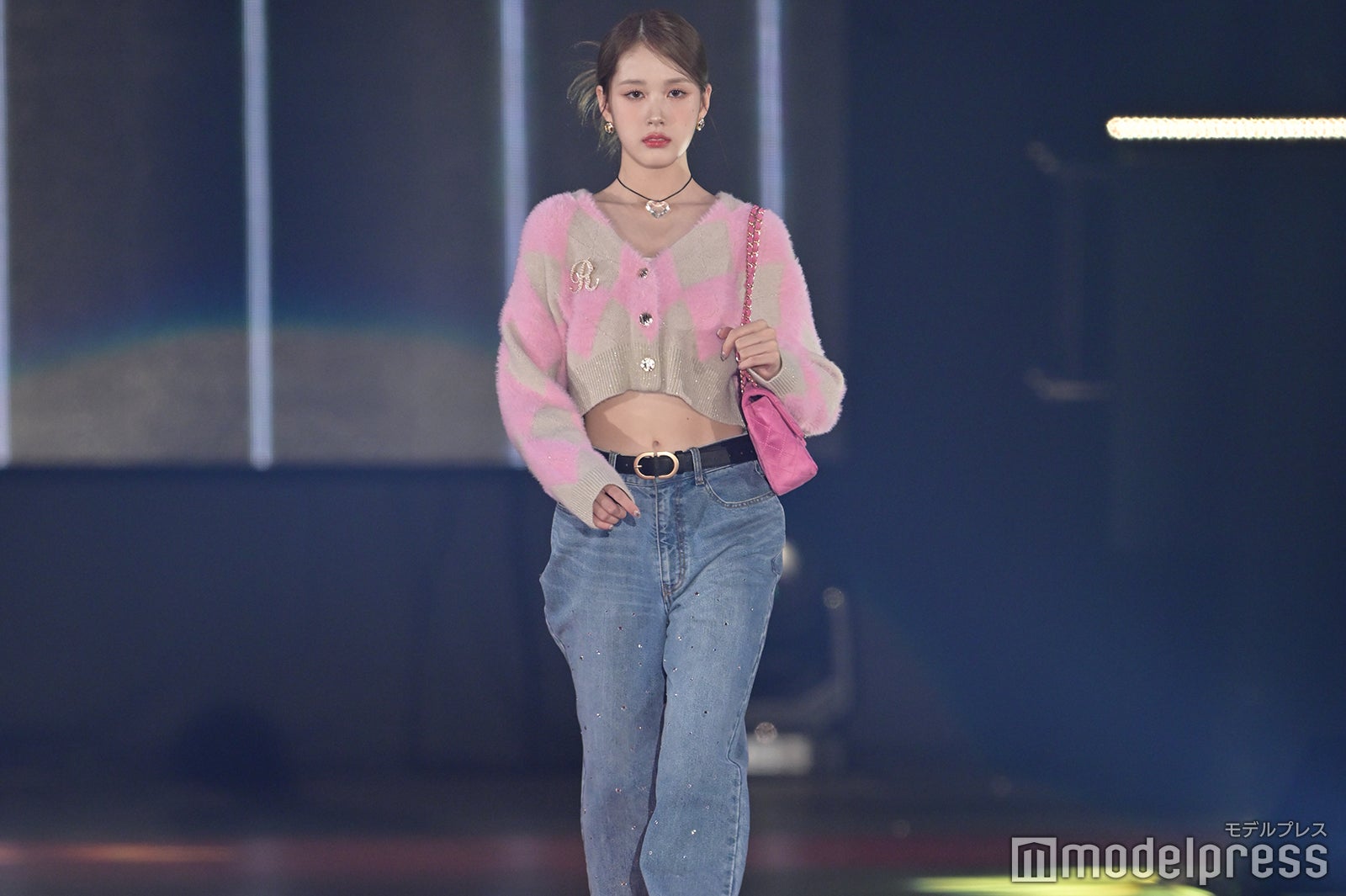 トップバッターを務めたジェイ(J)はミニ丈カーディガンにデニムを合わせ、鍛えられたウエストを披露。アイサ(ISA)は美しい黒髪をなびかせ、ブルーのカーディガンやレーストップスでガーリーなコーディネートに身を包んだ。シウン(SIEUN)は淡い黄色のメッシュニットとファーベストを組み合わせ、スミン(SUMIN)は大きなリボンを身につけたポニーテールを揺らし、観客に手を振りながら笑顔でランウェイを闊歩。セウン(SEEUN)は、首元に巻いたマフラーを使い可愛らしくポージングを決めた。