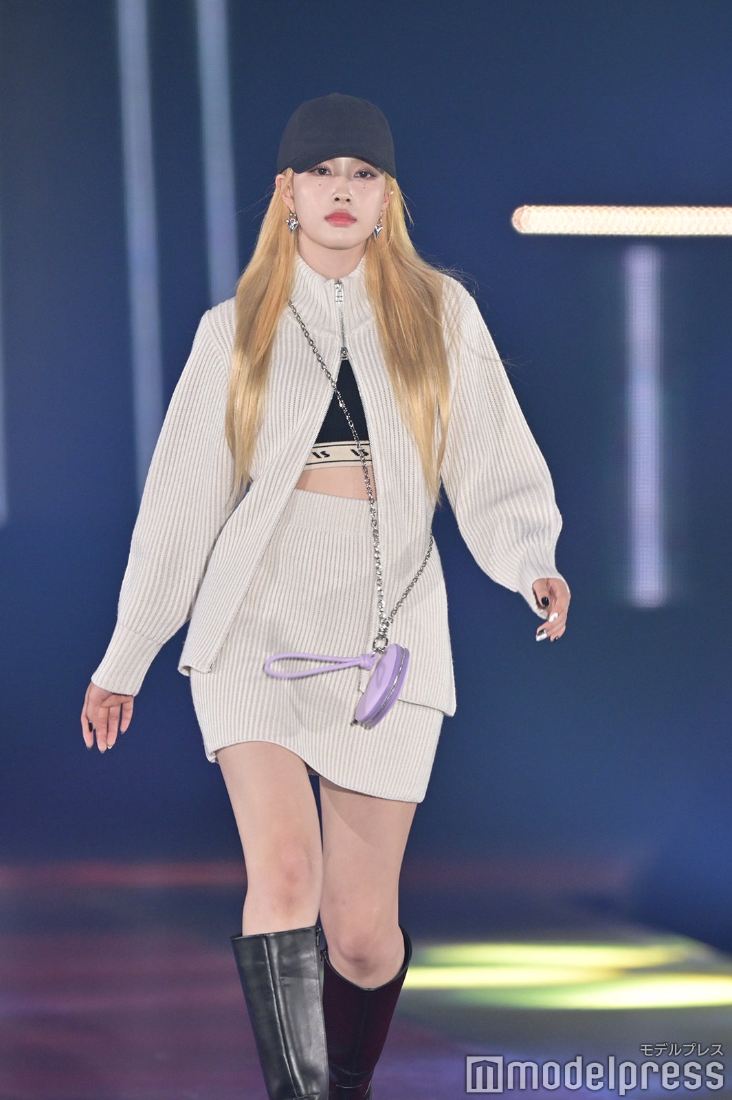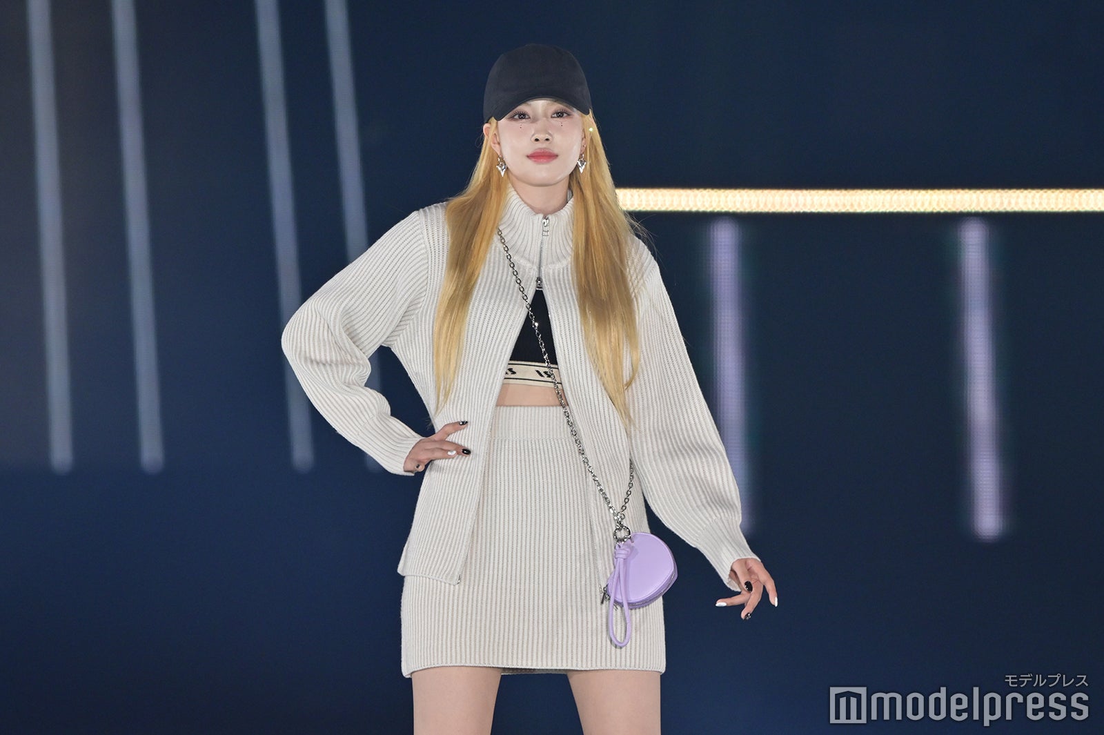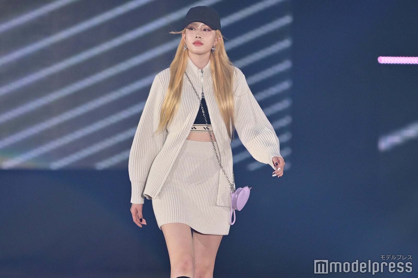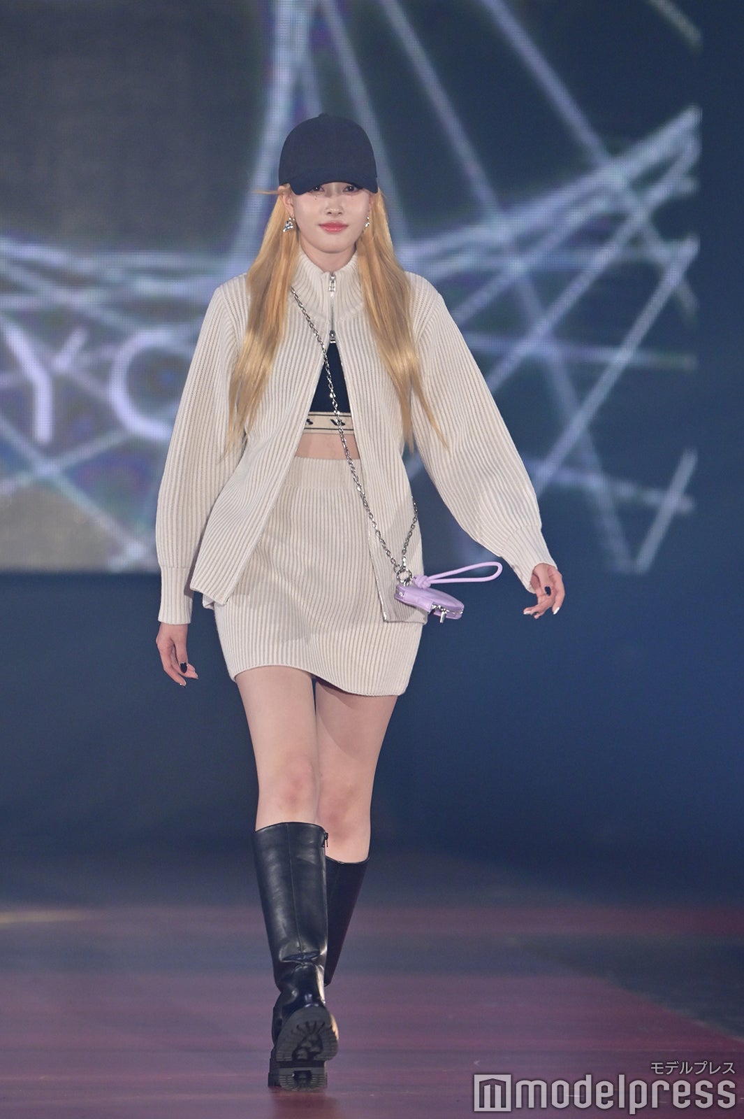 最後の登場となったユン(YOON)は、セットアップの中に着たビスチェやミニ丈のボトムスで抜群のスタルを披露。黒キャップを被り、ハイトーンヘアを際立たせた。