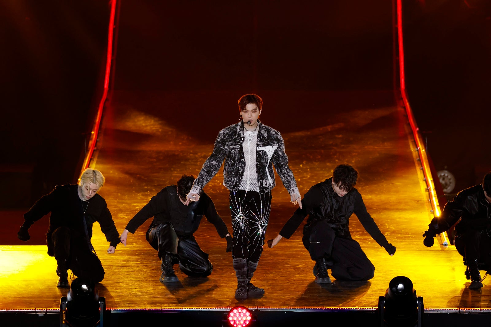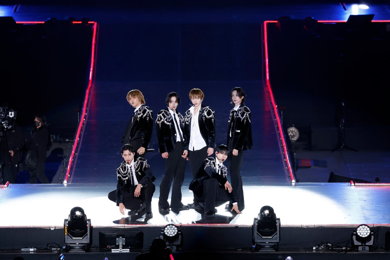 まずはKep1erがステージに現れ、Clean Banditの「Symphony」をダンスカバー。美しいシンクロダンスで会場を引き込むと、楽曲終盤にはその後ろから&TEAMが登場。各グループのメンバーがそれぞれ背中合わせになるなど、息ぴったりにパフォーマンスし、そのまま&TEAMへとバトンタッチした。&TEAMのステージでは、JO(ジョウ)が1人で中央にいるところにメンバーたちが寄り添うというストーリーが展開。その後全員で「Under the skin」をベースにしたアレンジミュージックで踊った。