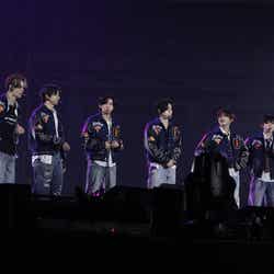 &TEAMはEJ(ウィジュ)・FUMA(フウマ)・K(ケイ)・NICHOLAS(ニコラス)・YUMA(ユウマ)・JO(ジョウ)・HARUA(ハルア)・TAKI(タキ)・MAKI(マキ)の9人組グループ。HYBEの日本本社HYBE JAPAN傘下のHYBE LABELS JAPAN初のグローバルグループとして2022年12月にデビューを果たした。今回のイベントでは、オオカミの鳴き声とともに彼等が登場し、キレキレのダンスブレイクからスタート。そのまま「Road Not Taken」へと続いた。