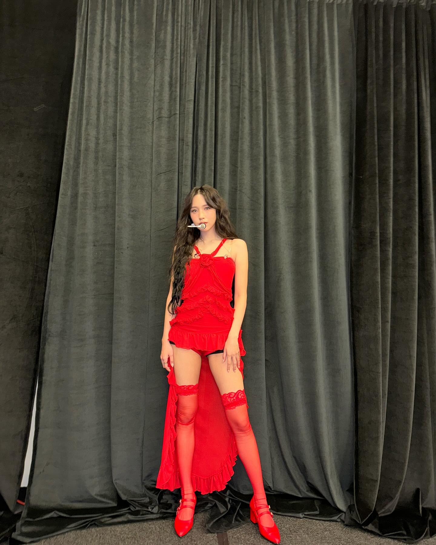 TWICEミナ、ミニ丈赤衣装&ニーハイソックスで美脚輝く「美しい」「スタイル抜群」の声
