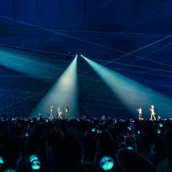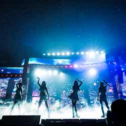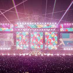 ユニットステージの後は、ホラー映画のような新しいブリッジ映像が導入されると、「Hypnosis」でそのイメージを引継ぎ、古い洋館セットの中で白い布を使った印象的なパフォーマンスを展開。そして今夏の「サマーソニック」でも盛り上がりを見せた「Accendio」で再び大きなファンコールが上がると、メンバーたちも「皆さんの声が大きくて驚きました」と感動の表情を見せた。