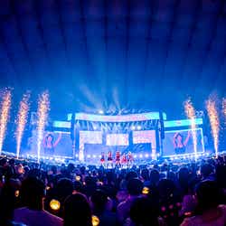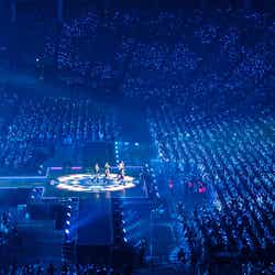 3曲目の「Blue blood」までいっきに駆け抜けたが、花火や銀テープなど冒頭から華やかな演出が彩りを添えた。軽い挨拶の後、アリーナ公演とは異なる「Blue Heart」、「Holy Moly」でムードを一変させる。そして、ヒット曲「Eleven」で、さらにファンの熱気を高めていった。